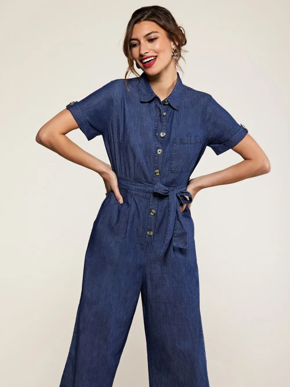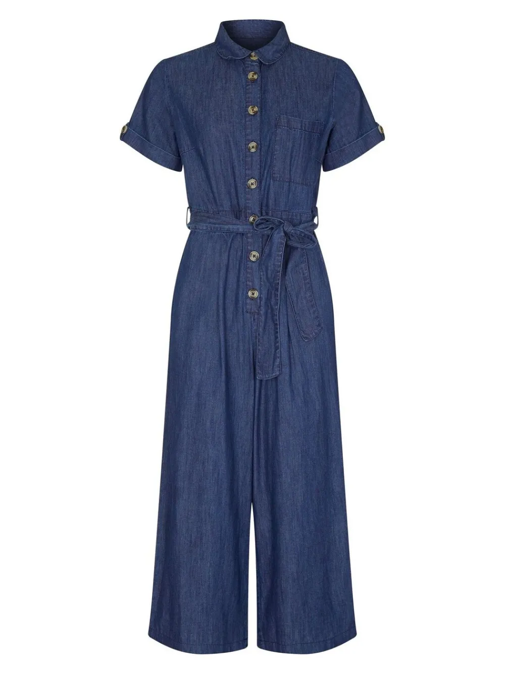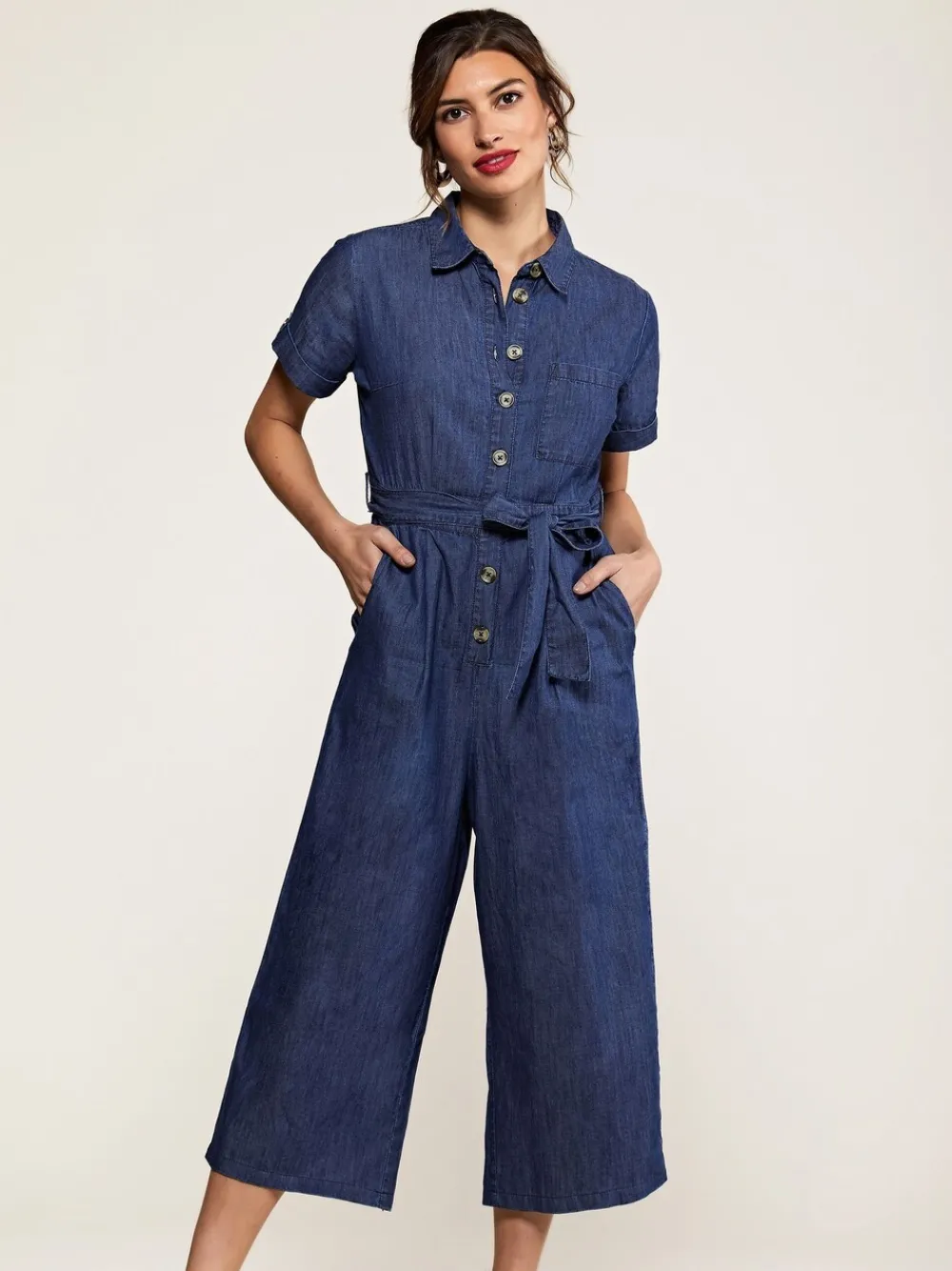 Kies voor deze moderne Denim Jumpsuit van Yumi als lichte keuze voor Kleding voor overdag. De broek heeft een Culottes-broek die tot onder de knie komt, schildpadkleurige knopen over de voorkant, een losse kraag en een tailleband die je zelf kunt strikken. De katoenen chambray-stof zorgt ervoor dat uw lichaam kan ademen in hotter klimaten. Regular binnenbeenlengte 51.5″ / 130,5 cm. Machinewasbaar. 100% katoen.