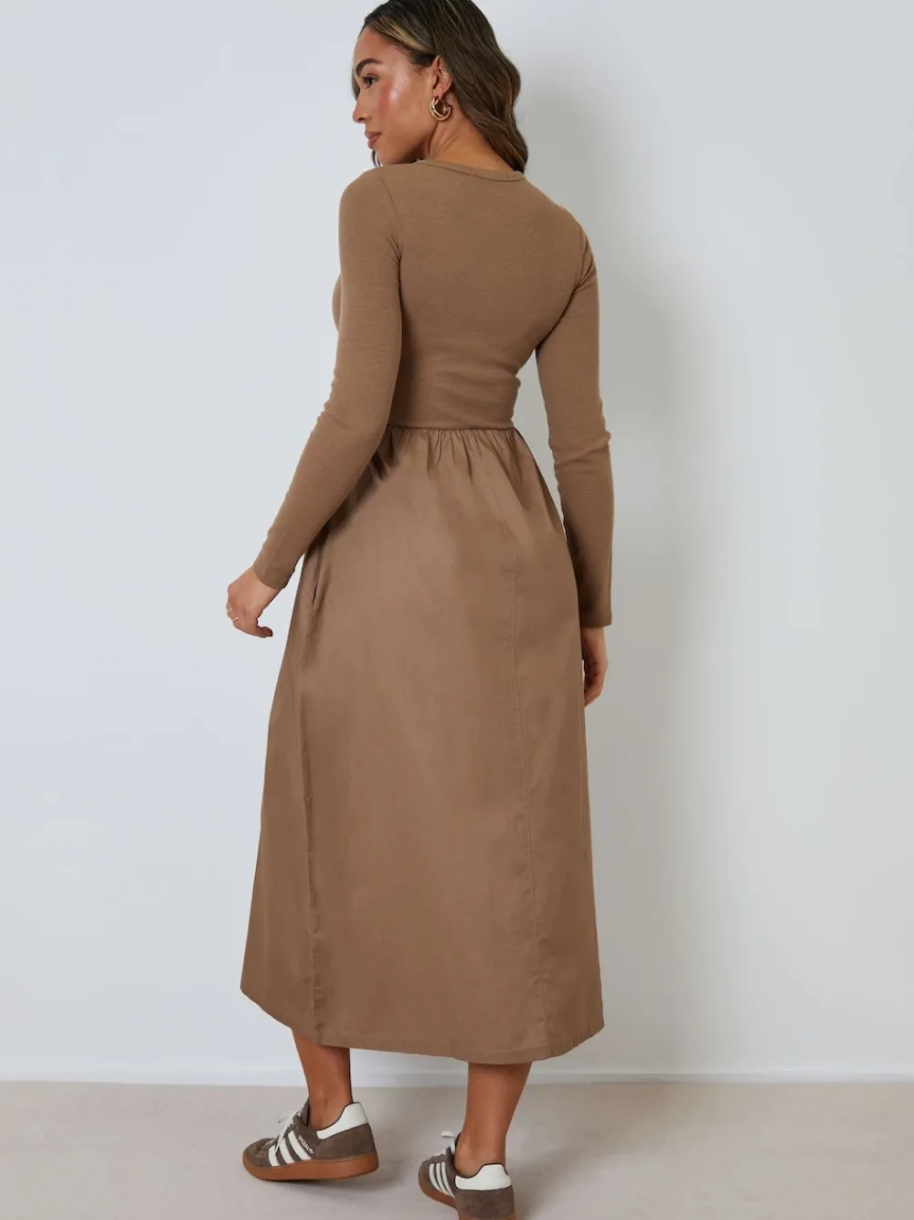 Elevate your style with this jersey poplin mix fab button-down dress from Threadbare. 2-in-1 mix fabric. Ribbed jersey bodice. Crew neck. Long sleeves. Three functional buttons, three fixed. Poplin skirt. Midaxi length. Two side pockets. Model wears UK size 8. Machinewasbaar. Top 47% katoen, 47% viscose, 6% elastaan. Rok 100% katoen.