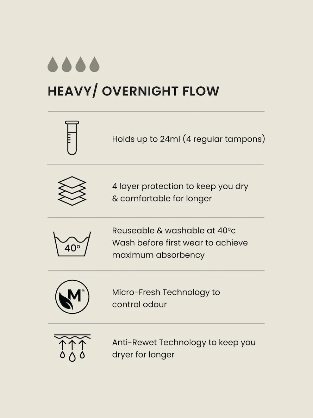 Heavy Flow Menstruatiebroekjes kunnen op zichzelf worden gedragen of als onderdeel van je gebruikelijke routine op dagen dat je zwaardere menstruaties hebt, in verschillende stijlen. Houdt tot 24 ml/ongeveer 4 gewone tampons vast Vierlaagse bescherming houdt je droog en comfortabel Gewoon wassen en dragen Was voor het eerste gebruik om maximale absorptie te bereiken, gebruik geen wasverzachter en hang te drogen Superzachte, comfortabele katoenmixstof. Let op: Dit product bevat het biocide zilverchloride (herdefinieerd van reactiemassa van titaniumdioxide en zilverchloride) Machinewasbaar. 2 x slipjes hoofdzakelijk 95% katoen, 5% elastaan. Inzetstuk 96% polyester, 4% katoen. Artikelen met het curve-logo zijn verkrijgbaar in de maten 18 en groter.