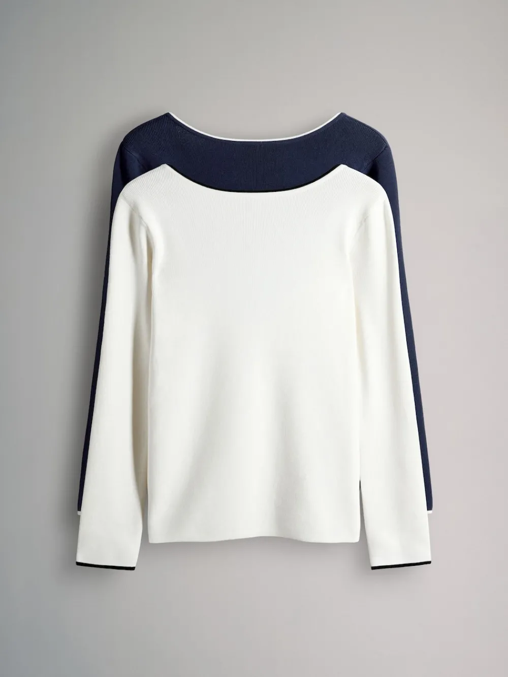 Elevate your essentials with THE SET 2 Pack Knitted Tipped Scoop Back Tops, offering sophisticated layering options in two classic colours: ecru and navy blue. These stylish tops are crafted from a soft ribbed knit fabric that provides a comfortable and flattering fit. They feature elegant long sleeves and a unique design element – a contrasting tipping detail at the cuffs and neckline. The standout feature is the stylish low V-back detail, which adds a contemporary twist and a touch of allure. These tops are perfect for wearing under blazers, or styled simply with jeans for a chic look. 2 pack Long sleeve Tipped Low V-back detail 2 x trui 70% viscose, 30% nylon.
