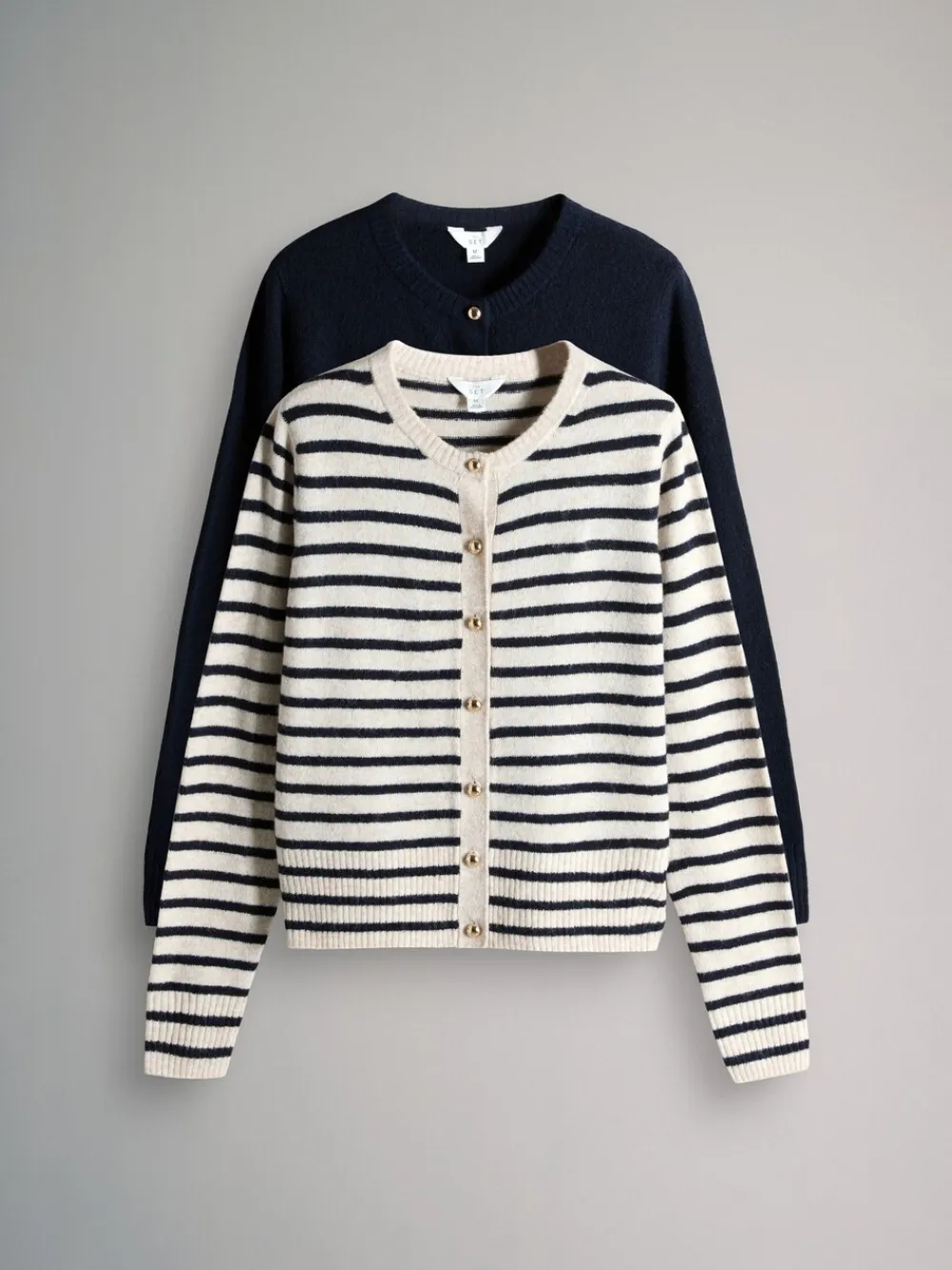 Cardigan 78% Polyester, 10% Acrylic, 6% Nylon, 3% Wool, 3% Elastane. Cardigan 82% Polyester, 7% Acrylic, 4% Nylon, 4% Wool, 3% Elastane.