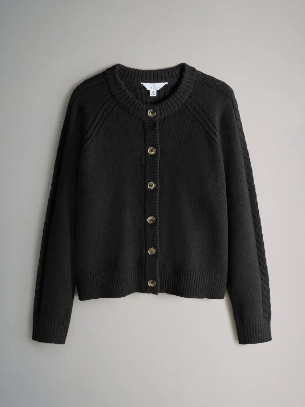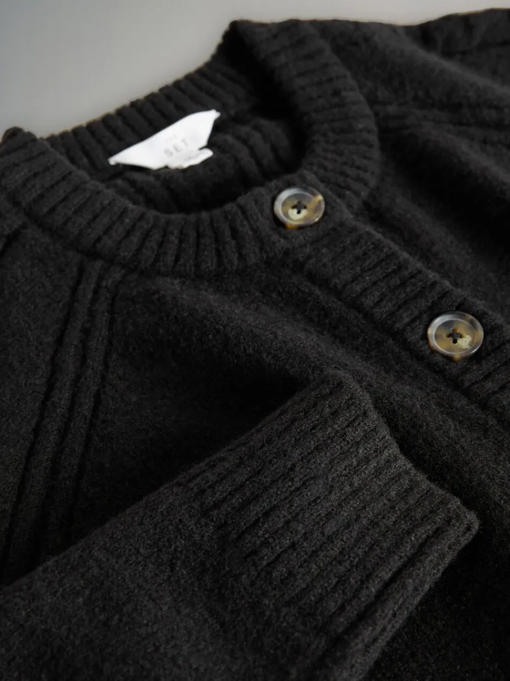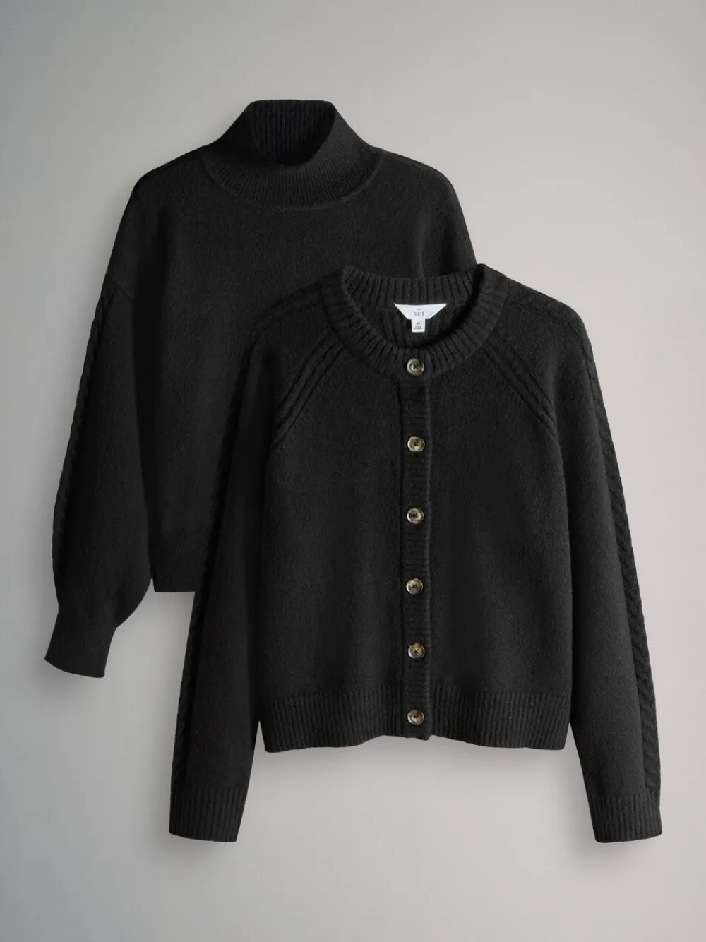 THE SET 2 Pack High Neck Jumper/Cardigan offers a timeless and coordinated look in classic black. This two-piece set includes a cosy high neck jumper and a complementary button down cardigan. Both knitwear pieces feature subtle cable details on the sleeves and centre back for an elevated texture. This versatile pairing allows you to mix and match the pieces to provide warmth and style. 2 pack Cable details High neck jumper Button down cardigan Cardigan and Jumper 55% Polyester, 30% Acrylic, 13% Nylon, 2% Elastane.