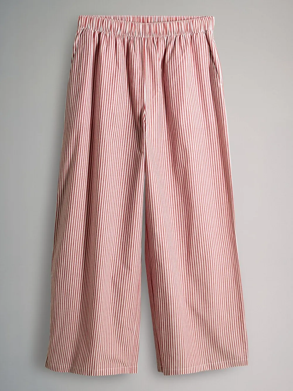 Embrace a relaxed yet polished look with THE SET 2 pack pull-on trousers. This set includes a navy stripe and a red stripe pair, both crafted from a breathable polyester-cotton blend. Designed for ultimate comfort, they feature a pull-on elasticated waist and a wide-leg loose fit, making them an effortless addition to your everyday wardrobe. 2 pack Pull-on Relaxed fit 2 x broek 65% polyester, 35% katoen.