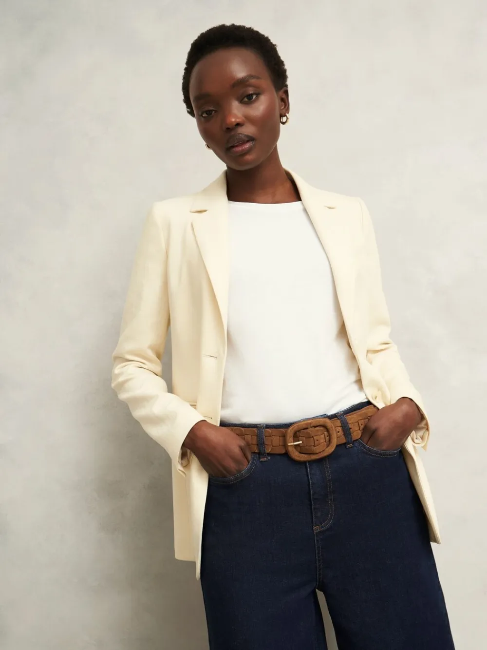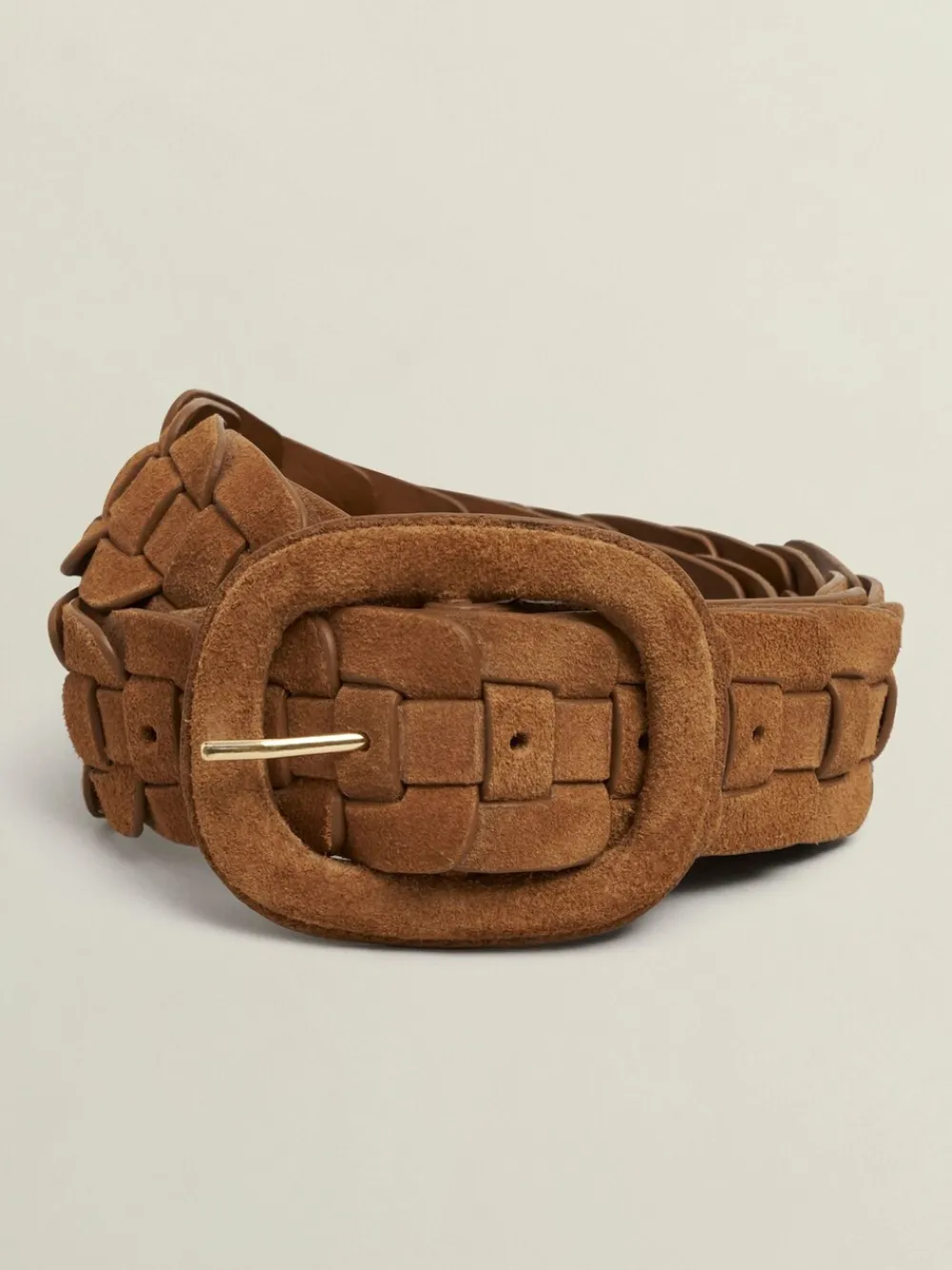 Textuurverhoging. De Abbie-riem is een seizoensgebonden variant op een klassieker: een vernieuwde versie van zacht suède met een geweven afwerking. Zachte suède afwerking. Geweven ontwerp. Ronde gesp. Verstelbare lengte. Tonale esthetiek. 100% andere vezels.