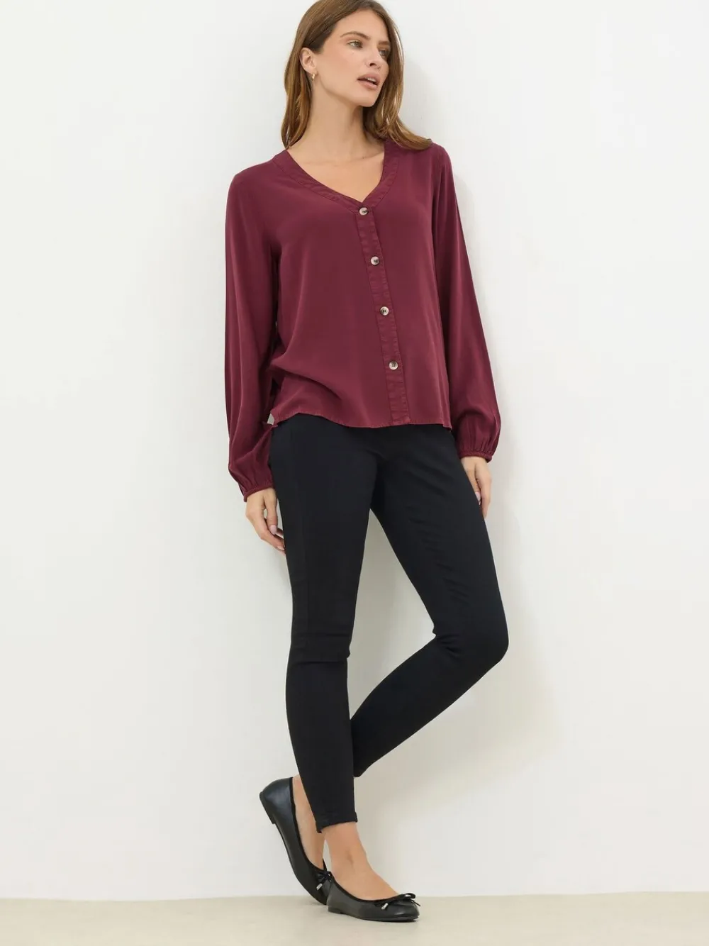 Fit & Fashion Notes: Give your everyday wardrobe a new season refresh. Made from a breathable woven fabric, this blouse features a button front design, long elasticated sleeves, a v-neckline, and a dipped hemline. Wear with jeans and flats for an everyday look you can rely on. Features: Acid wash Button front design Long elasticated sleeves V-neckline Dipped hem Made from a breathable woven fabric 100% Viscose Length from approx: 66cm/25.9” Machine washable Model is 5’7”/170cm and wears size UK 10/EU 38. Machinewasbaar. 100% viscose.