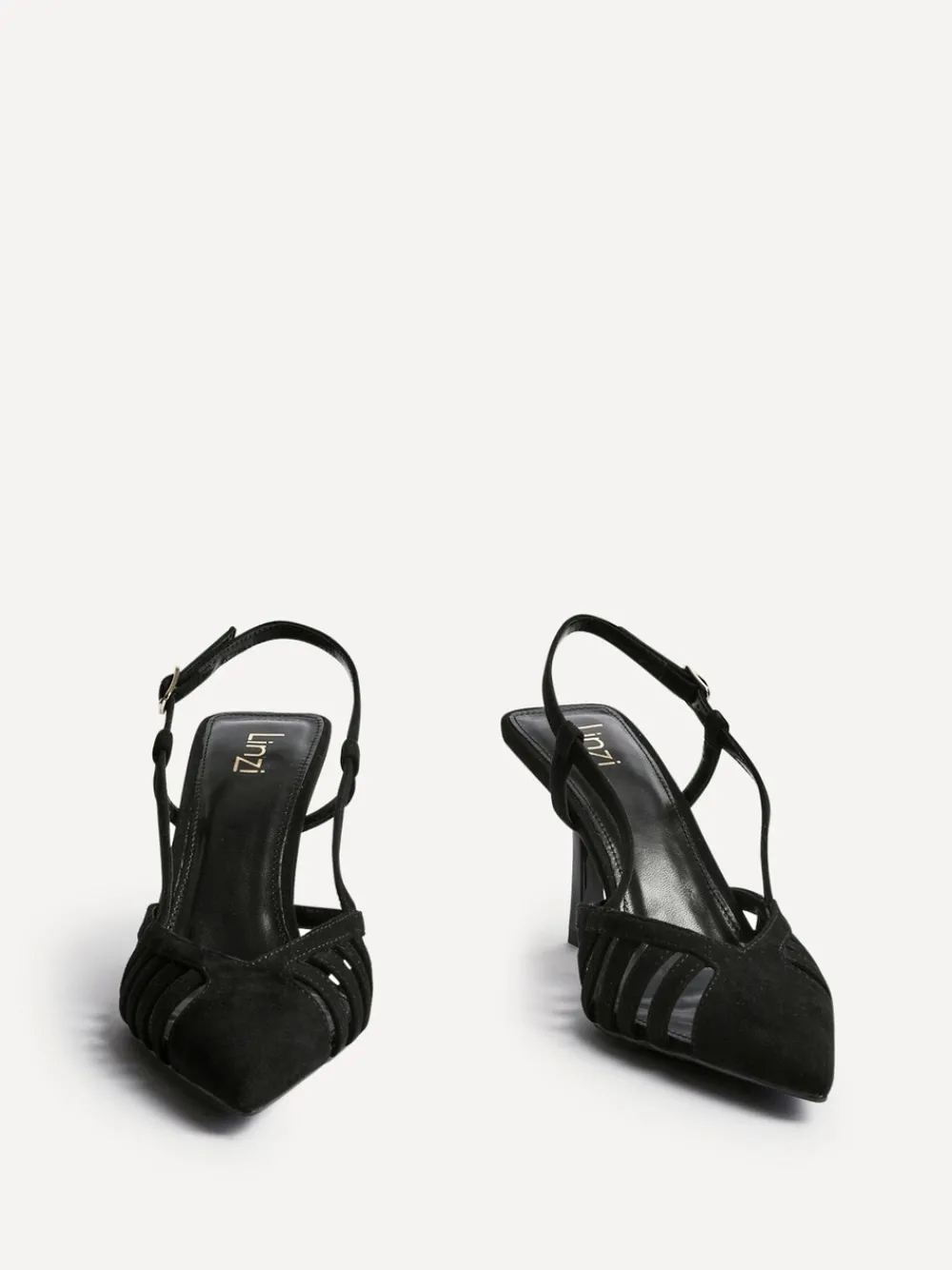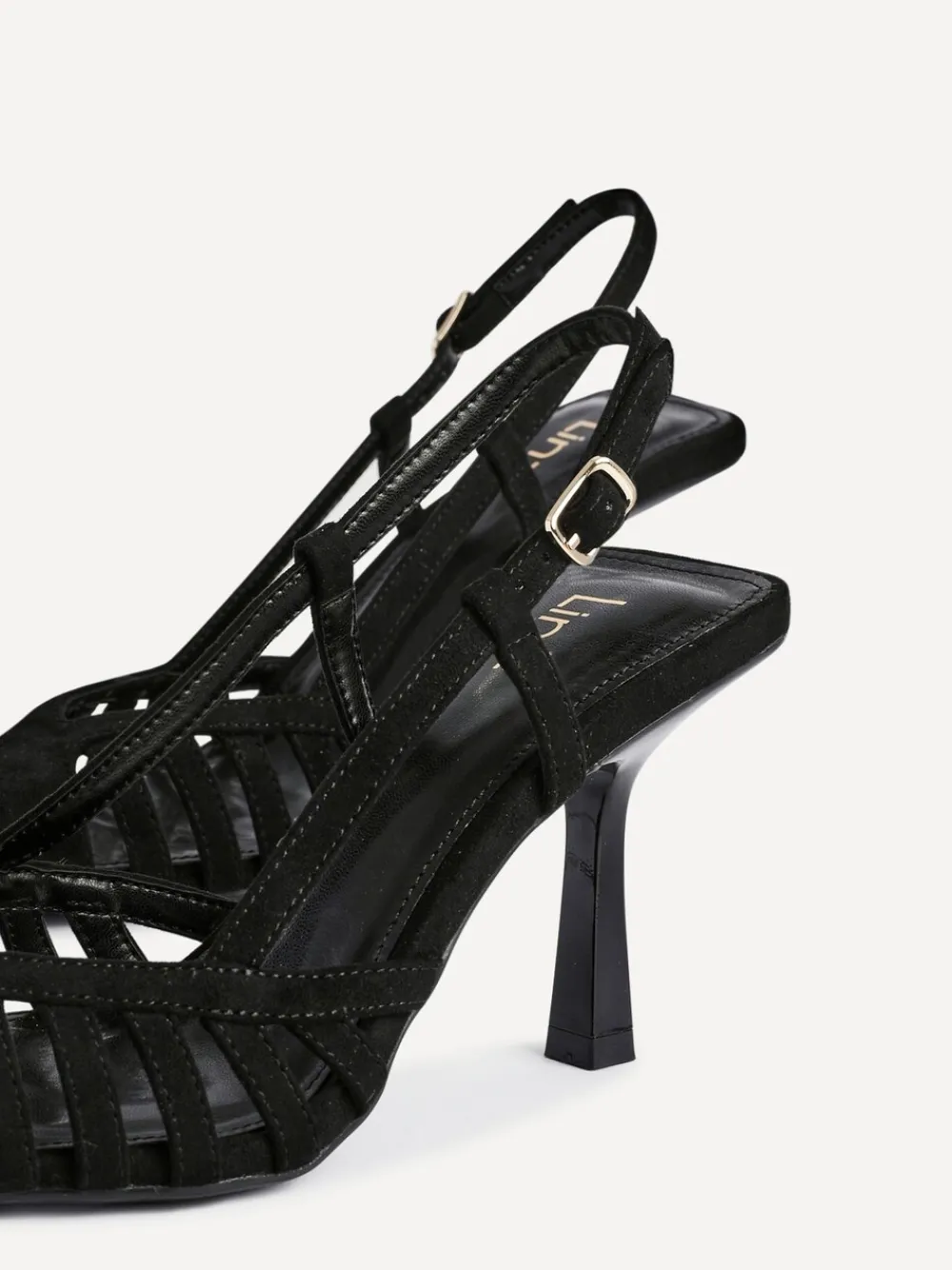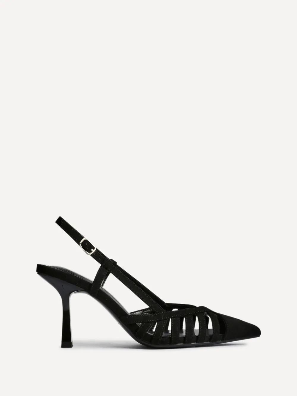 Deze zwarte hakken zijn prachtig vervaardigd uit hoogwaardig suède en hebben een puntige neus en delicate, uitgesneden bandjes voor een kooiachtig ontwerp. De slingbackband biedt stabiliteit, terwijl de zachte binnensok de hele dag comfort garandeert. Geef elke outfit een upgrade met deze verfijnde en elegante hakken. Hakhoogte 8 cm. Bovenwerk – textiel; voering en voetbed – Textiel zool – Andere materialen.