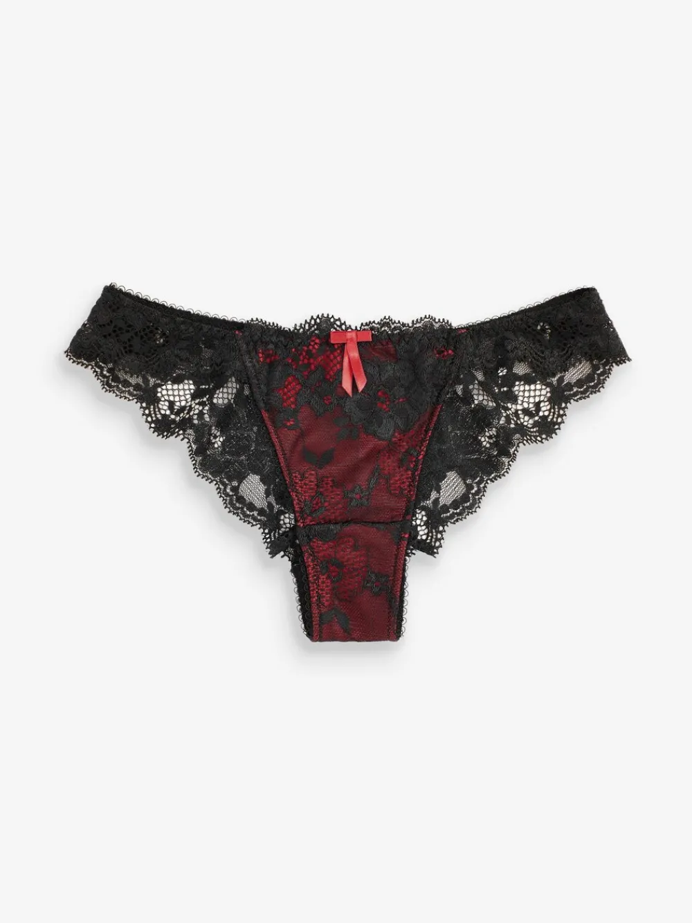 De Pour Moi Rood/Roze Amour Brazilian Brief heeft strakke lijnen aan de driehoekige voorkant en is voorzien van het Heerlijk zacht kant waar je van houdt. Alleen met de hand wassen. 92% Nylon, 8% elasthaan.