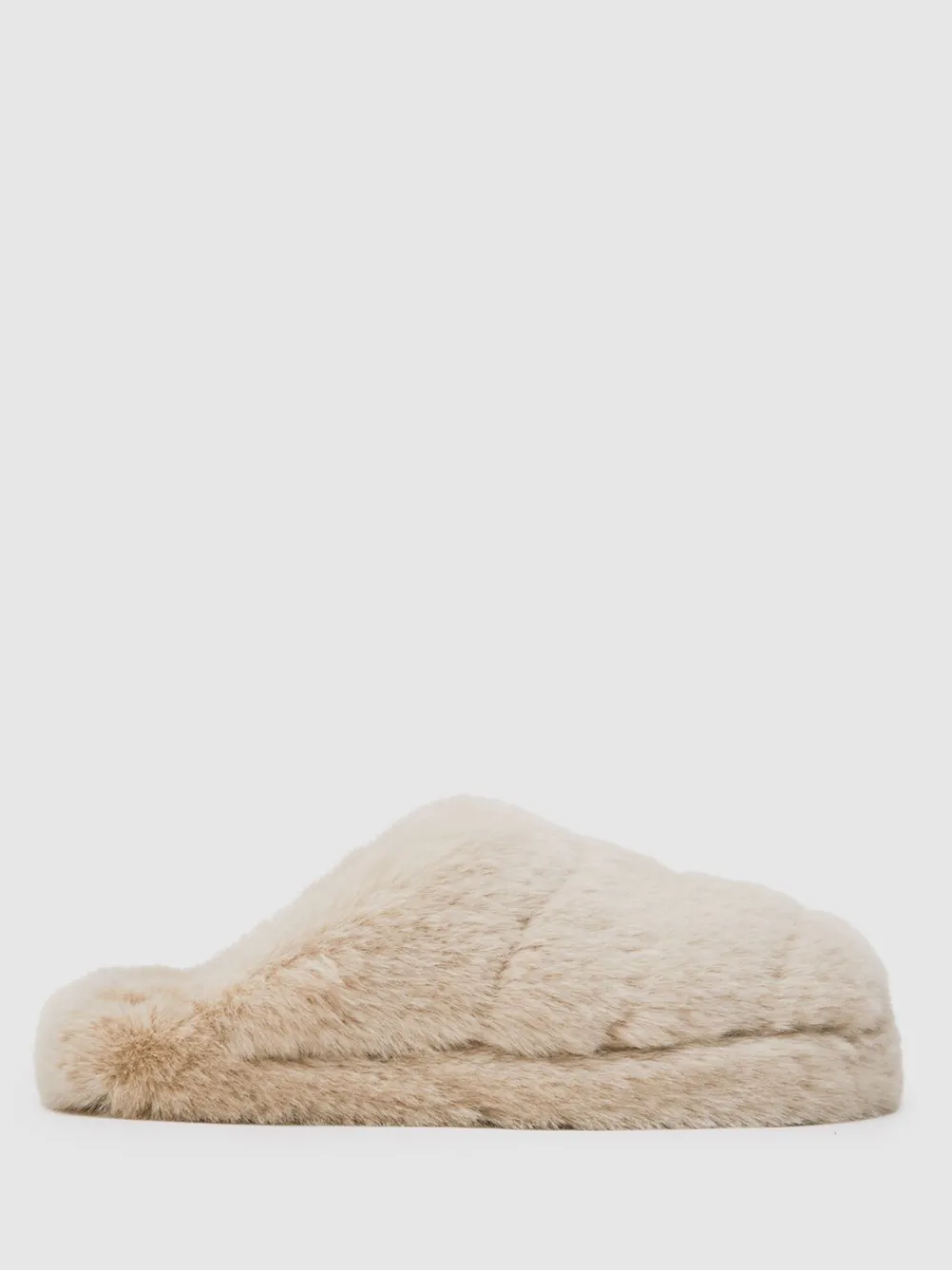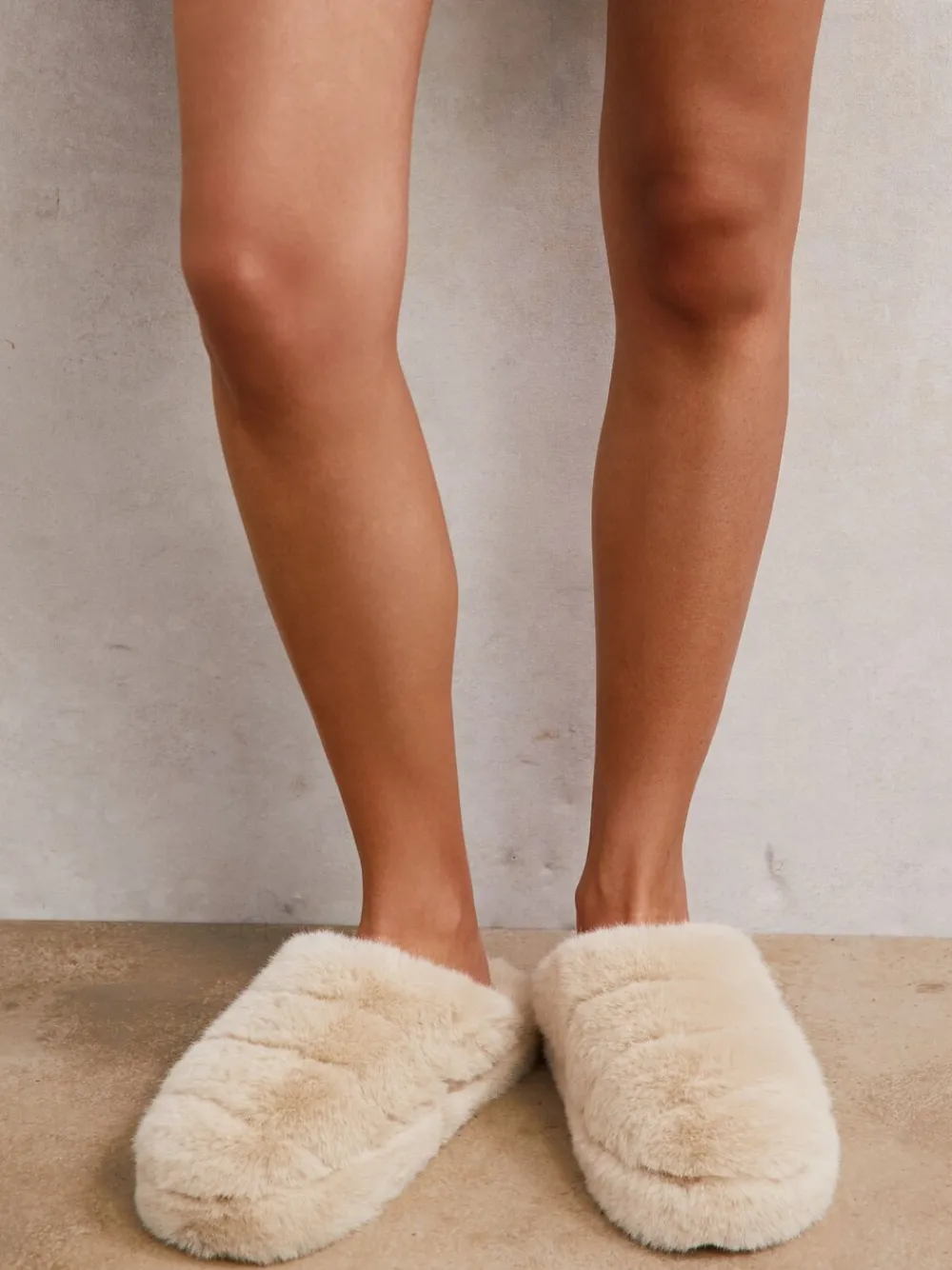 The Andrea cream slippers are crafted from fluffy long-haired faux fur for a cosy, indulgent feel. A round toe and chunky sole complete this relaxed, at-home style. Faux fur Fluffy texture 100% polyester.