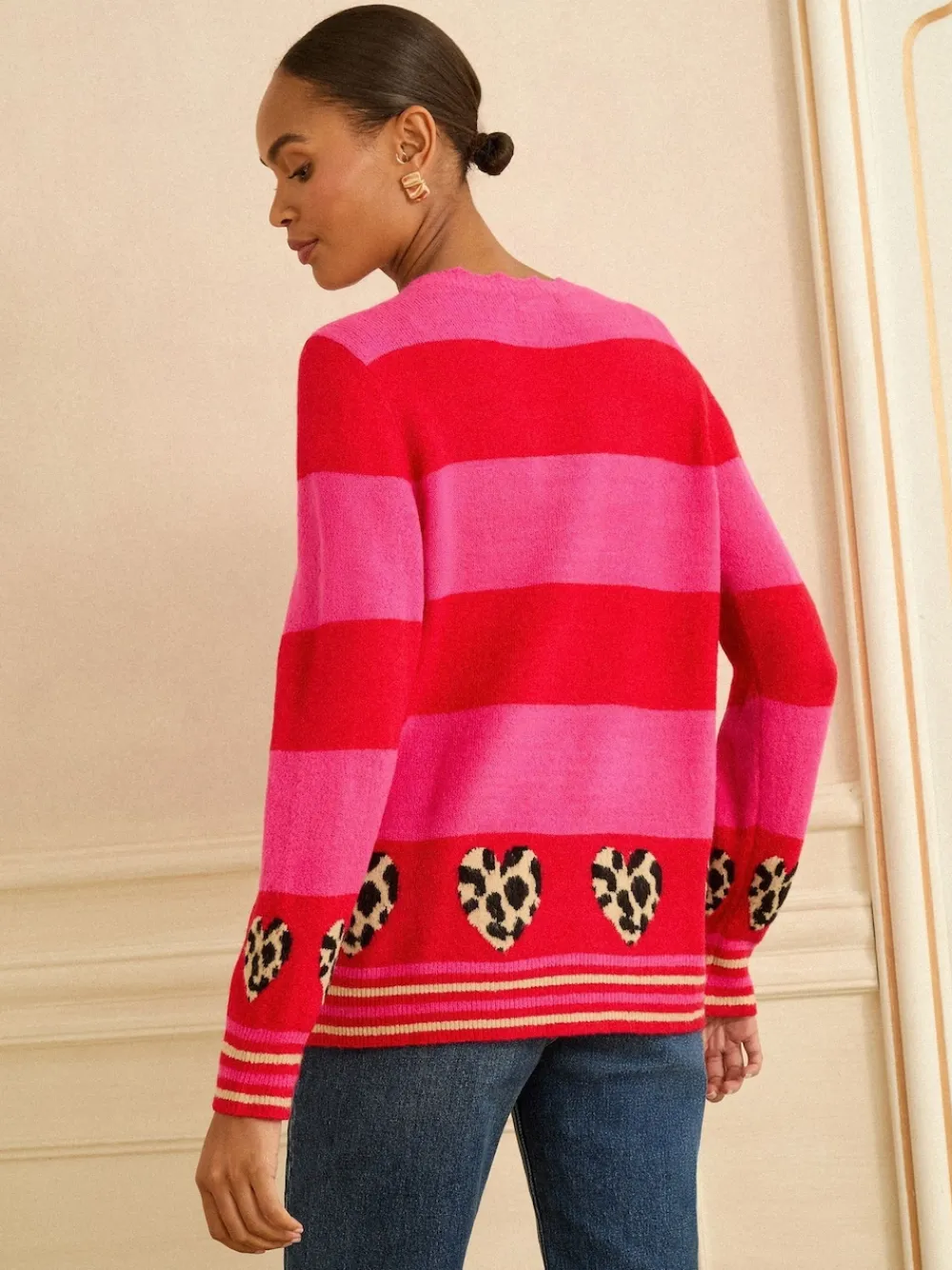 Achieve a cosy yet elevated look with the Love & Roses Pink and Red Stripe Animal Heart Jumper. Crafted from a soft, warm knit fabric, this jumper offers supreme comfort for any occasion. The vibrant red and pink stripe design is beautifully detailed with an animal print heart motif band along the hem, accented by red, pink and cream stripes on the hem and cuffs. Further refined touches include a delicate scalloped edge on the crew neckline, making this an effortlessly stylish piece for layering. Cosy knit fabric Scalloped crew neckline Heart design 68% acryl, 30% nylon, 2% elastaan.