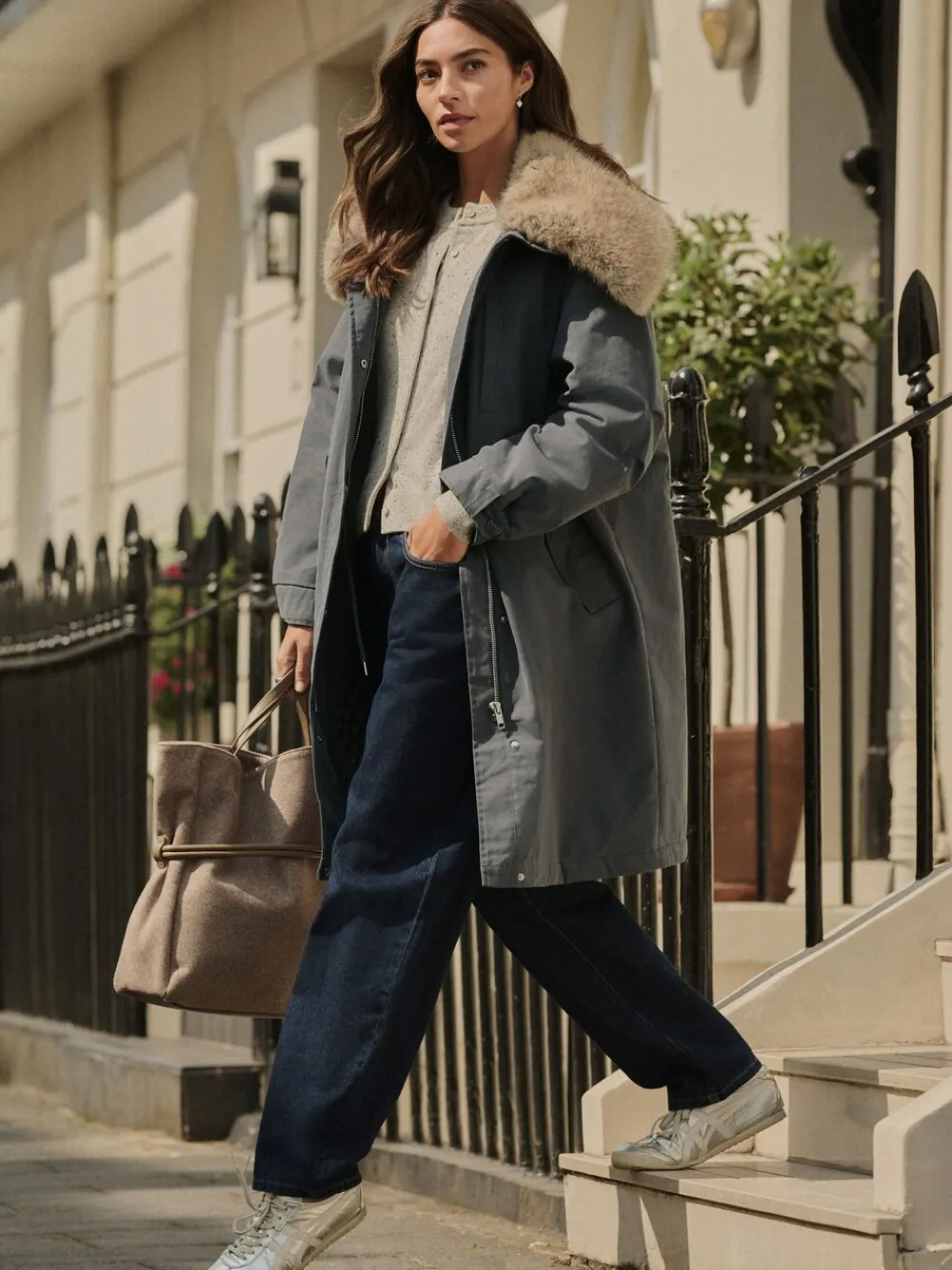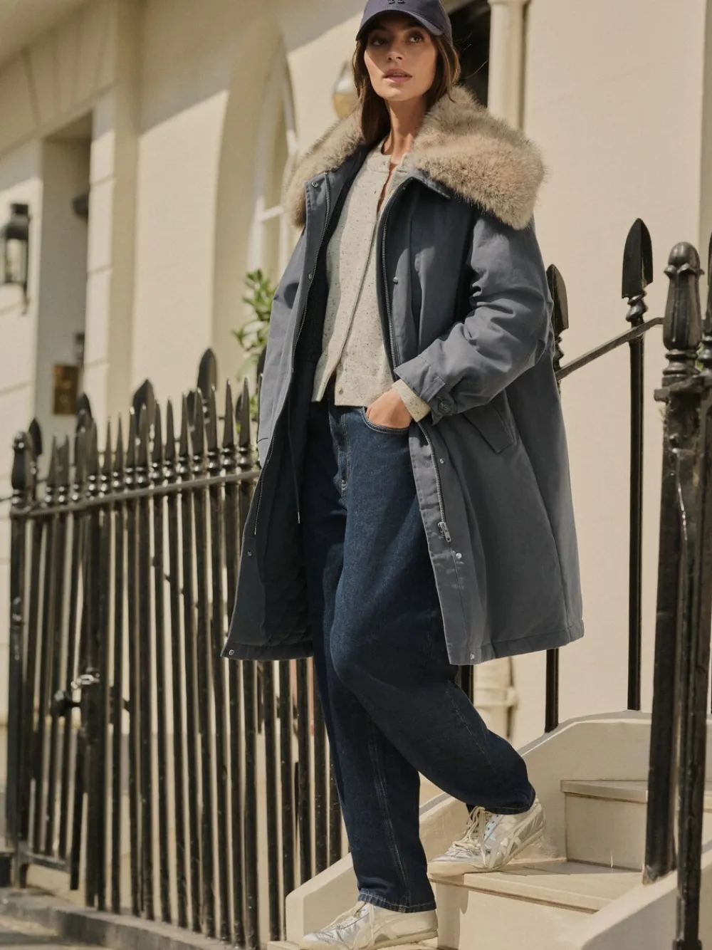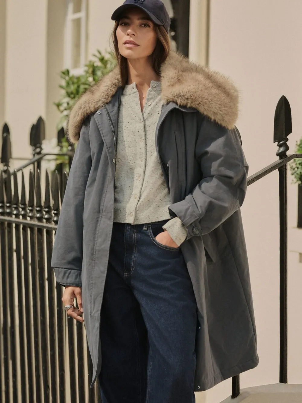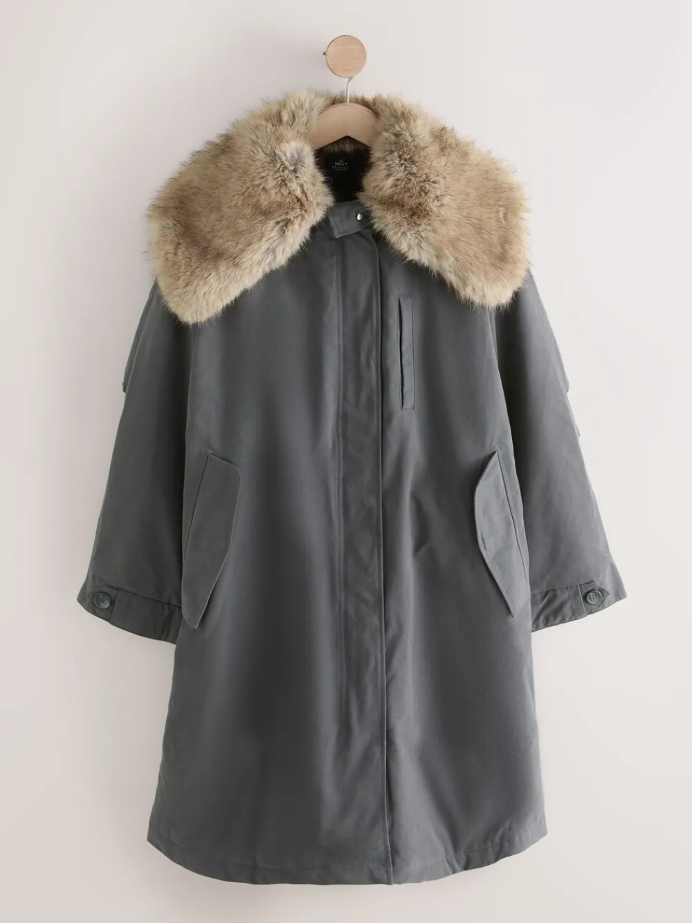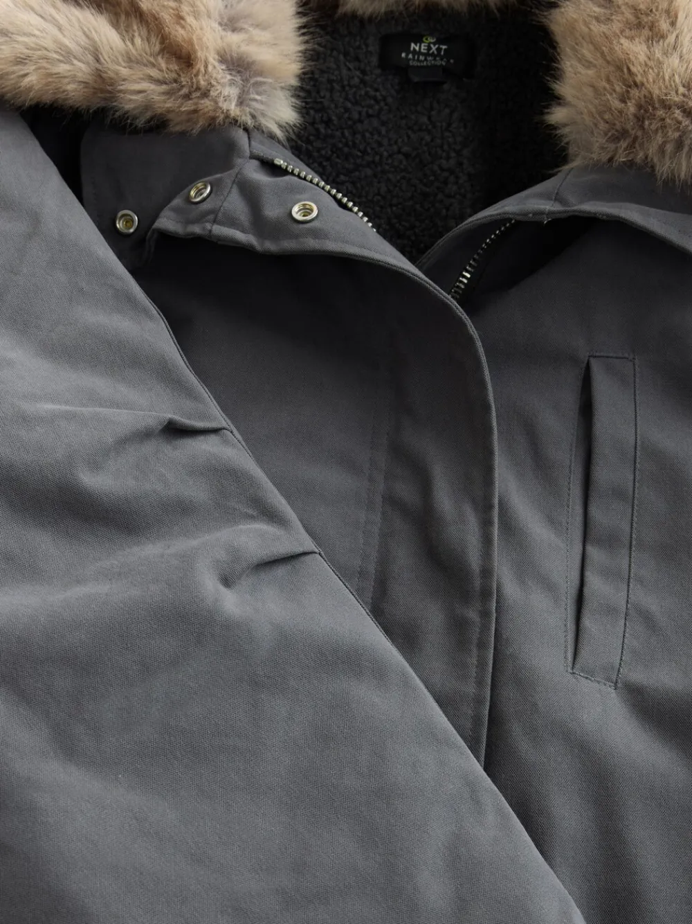 Stay warm and cosy this winter in this luxurious charcoal grey parka. This premium coat features a wide, dramatic faux fur collar and a snug borg lining for ultimate comfort. The practical drawstring waistband allows for an adjustable fit, while button cuff detailing adds a refined finish to this cold-weather essential. Luxury parka style Wide faux fur collar Borg lining Charcoal grey colour Drawstring waistband Button cuff detailing Hidden zip and popper fastening Standaard van het midden van de nek tot de zoom 39.5″ / 100 cm. Machinewasbaar. Hoofdmateriaal 79% katoen, 21% nylon. Voering 100% gerecycled polyester. Voering mouw 100% gerecycled polyester. Vulling 100% gerecycled polyester. Boord 100% gerecycled polyester.