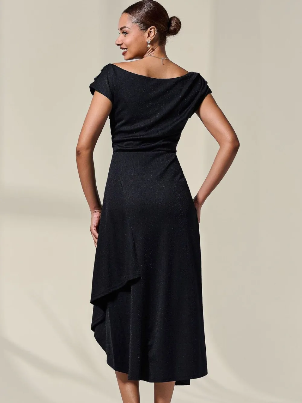 De Asymmetric Draped Midi Jurk van Jolie Moi is verfijnd en elegant en zorgt ervoor dat u zich op uw best voelt. De jurk heeft een zwierig silhouet en een unieke geplooide halslijn. U kunt de jurk op verschillende manieren dragen, bijvoorbeeld off-shoulder of met een watervalhals. De asymmetrische wikkelzoom voegt een speels element toe aan dit stijlvolle kledingstuk, terwijl de lengte ervoor zorgt dat het stijlvol blijft. Dankzij de glinstering in de stof is deze jurk het perfecte avondjurkje, en zit hij ook nog eens comfortabel. Dit over-het-hoofd model is volledig gevoerd met het zachtste jerseymateriaal voor extra comfort, zodat u de hele nacht kunt dansen. De lengte van het model is 176cm en het model draagt maat 8, lengte 124cm Machinewasbaar. 72% polyester, 24% andere vezels, 4% elastaan.