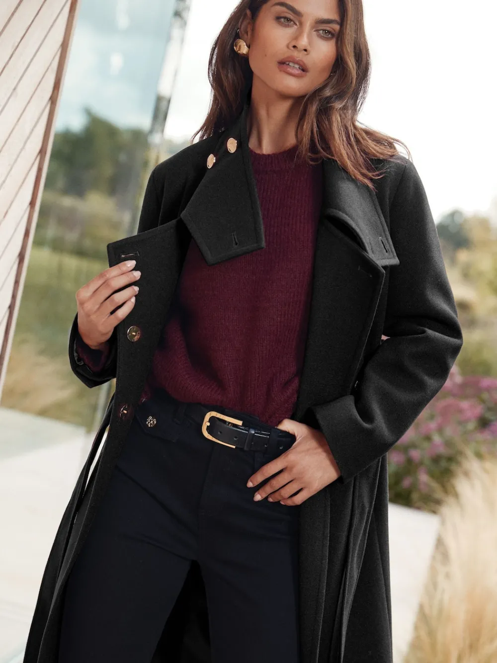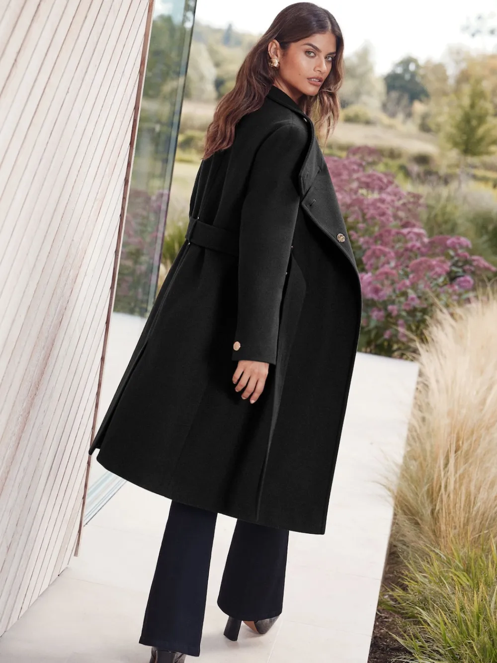 Perfect for keeping warm this Autumn/Winter season, this sleek funnel neck coat offers a sophisticated, tailored look. The fit is enhanced by a flattering belted waist and high funnel collar. Finished with glam metallic trims, side pockets, and a hidden popper fastening, it is the ultimate cold-weather statement piece. Sleek funnel collar neckline Adjustable belted waist Exposed buttons and hidden popper fastening Glam metallic trims Side pockets Hoofdbestanddeel 100% polyester. Voering 100% polyester.