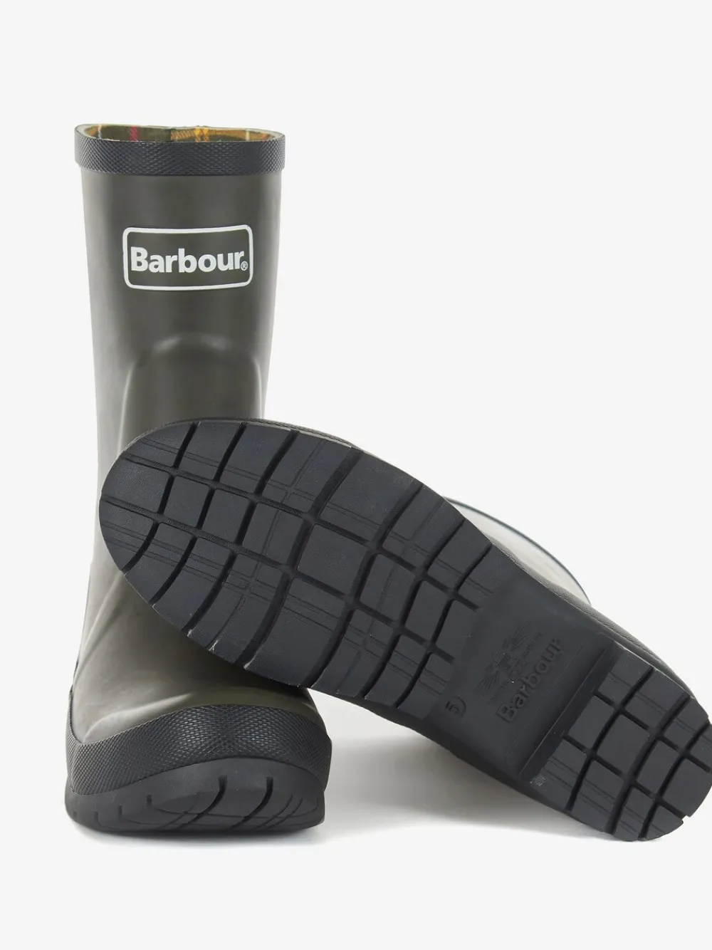 Gloednieuwe, halfhoge Wellington-laarzen met exclusieve Barbour-buitenzool en herhaald Barbour-logo op de achterkant. Sinds de oprichting in 1894 is Barbour nog steeds een familiebedrijf in het noordoosten, de belichaming van een Britse levensstijl en een legendarisch merk voor buitenkleding. Barbour leverde de eerste weerbestendige kleding aan een gemeenschap van zeelieden en vissers en produceert nog steeds waxjassen, regenlaarzen en waterdichtingen in meer dan 40 landen. Bovenwerk – overige materialen. Voering en voetbed – Textiel zool – Andere materialen.