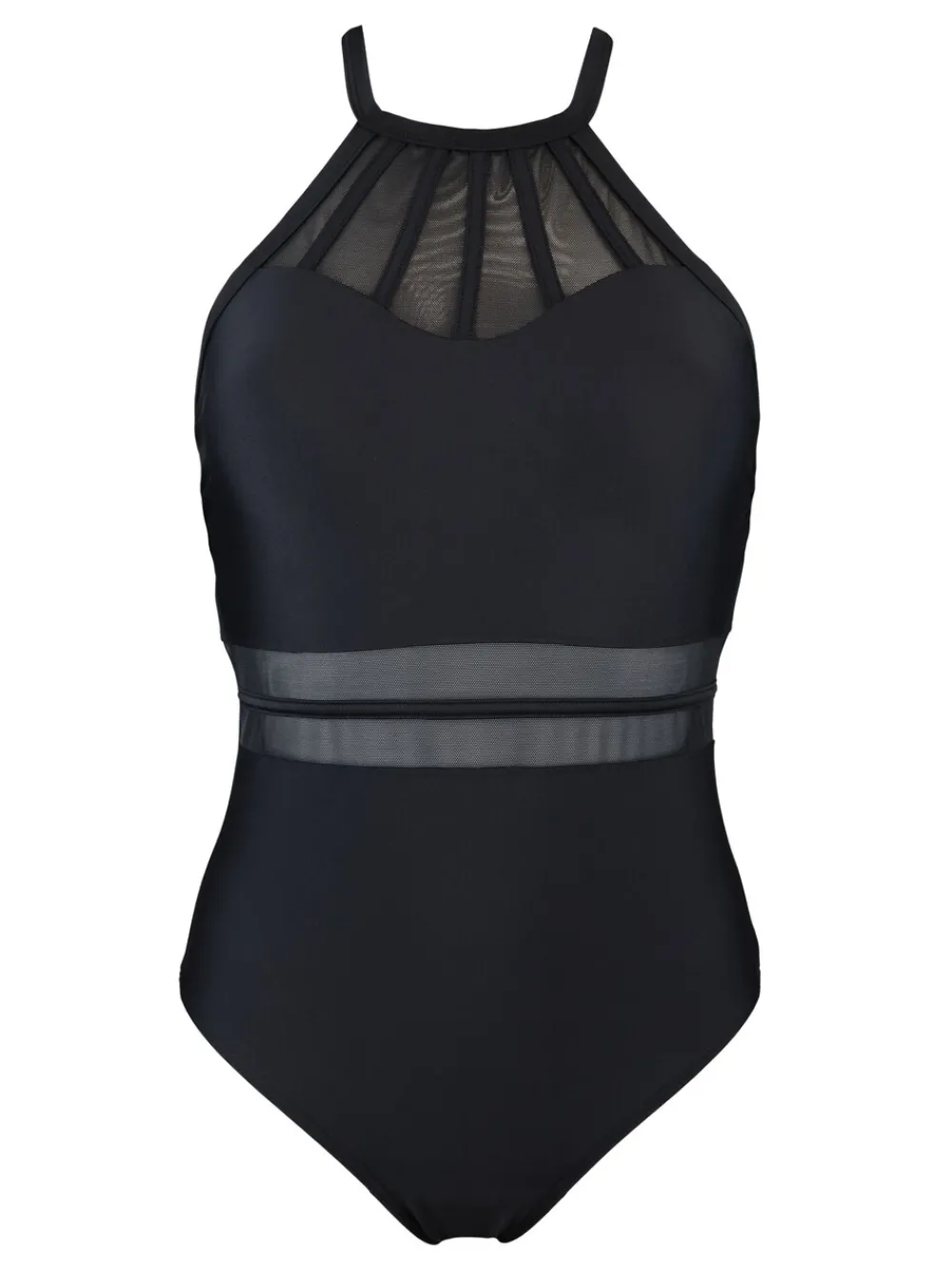 Our Beach Bound High Neck Swimsuit has it all going on! Its high neck gives that fashion edge whilst the light mesh panels in the body and neck create a super flattering shape. With moulded pads, secret shelf support, and adjustable straps, you’ll feel secure as you soak up the sun. Machinewasbaar. 80% polyester, 20% elastaan.