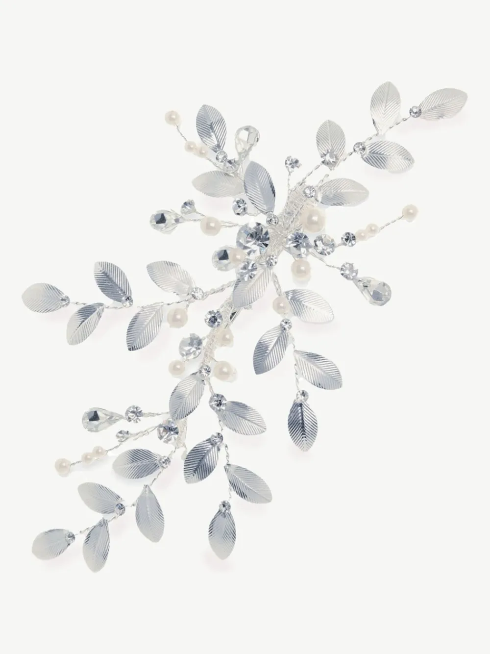 Stunning Leafy Bridal Clip Sparkling crystals and pearls are interwoven between delicate hand-enamelled leaves. Relaxed and beautiful, this design would be perfect for brides wanting an informal, fairytale accessory, and is also ideal for bridesmaids. Set with genuine Austrian Crystals cut with facets to look like real diamonds Dazzling crystal beads for real sparkle Lustre manmade ivory pearls Hand-enamelled elements Featuring a clip for easy wear, even on fine hair. 50% Silver (Plated), 40% Cubic Zirconia, 10% Stone.