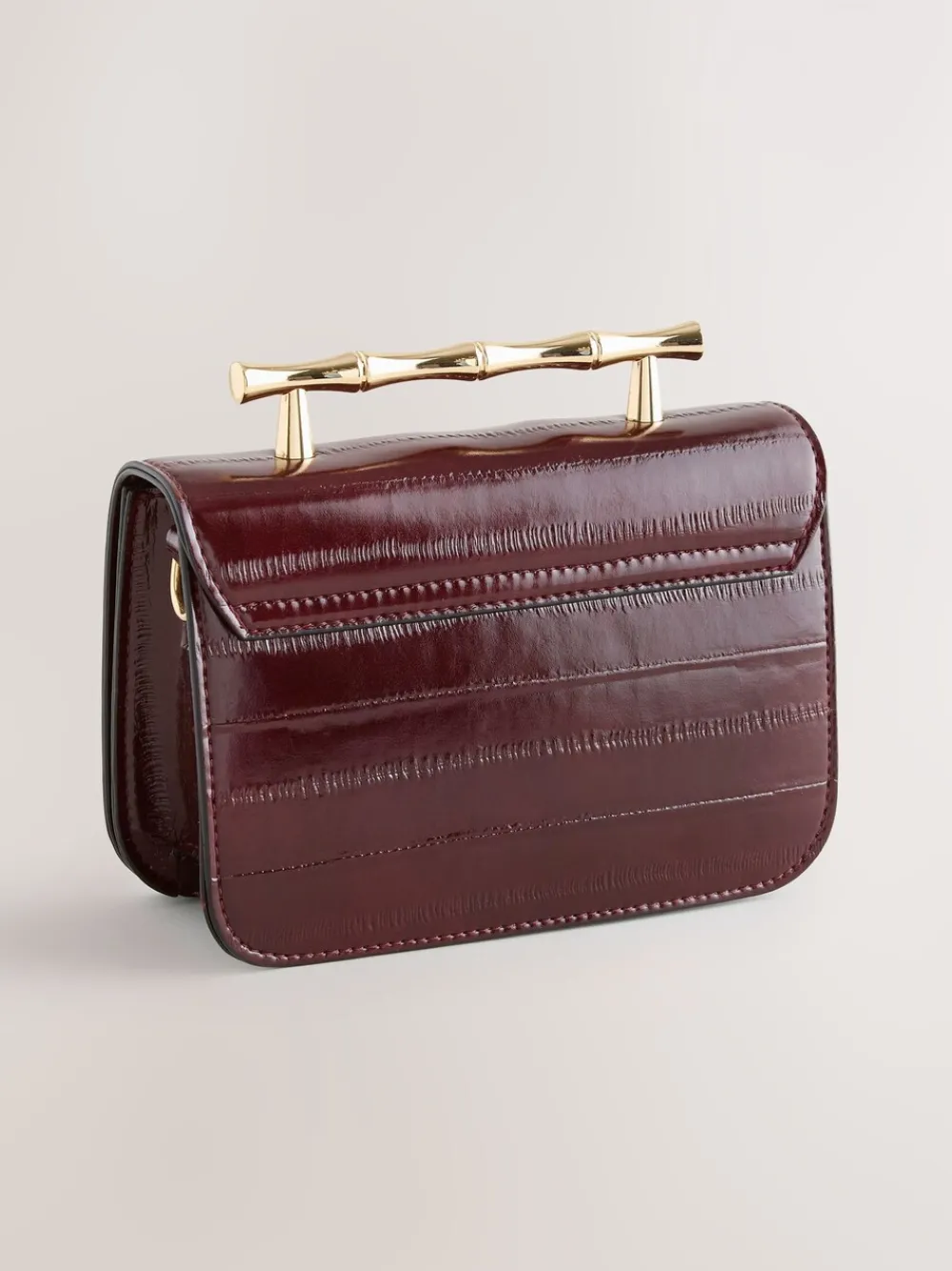 Elevate your accessories collection with this striking berry red bag. Featuring a luxurious mock croc texture and statement gold hardware top handle, it secures with a magnetic close. Complete with an adjustable strap for versatile styling. Mock croc texture Gold hardware top handle Magnetic close Adjustable strap Hoogte 12 cm Breedte 17 cm Diepte 7 cm Buitenkant 100% polyurethaan. Voering 100% gerecycled polyester.