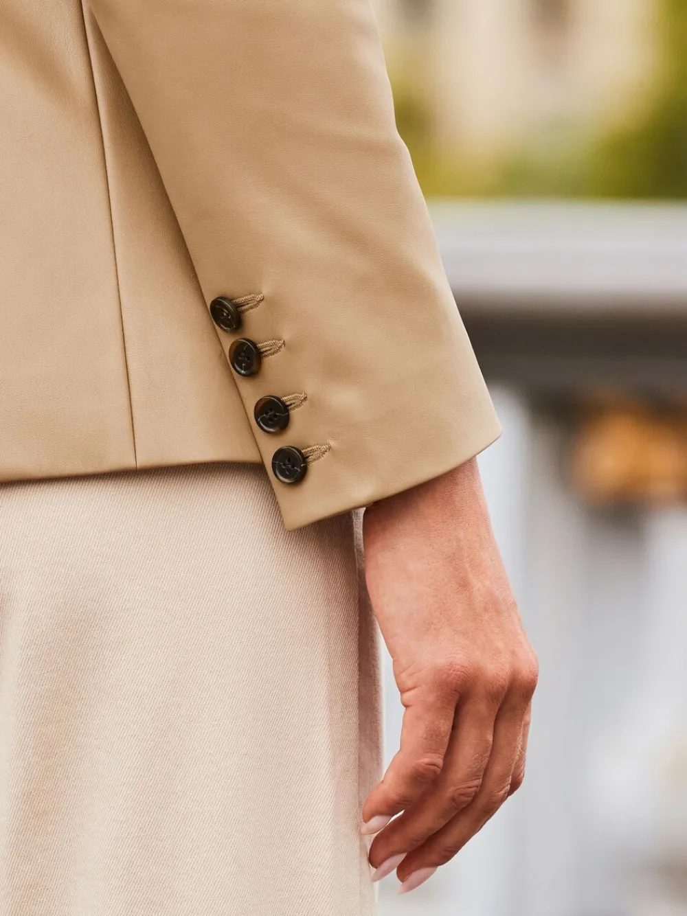 Je favoriete blazer geüpgraded, ons imitatieleer is zo zacht en comfortabel, flatterende single-breasted sluiting, chique neutrale tint – Het past bij alles, overdag chic, ’s avonds sexy. Het is gemaakt voor jeans en een mooi topje. Het model is 5 9 en draagt een Britse maat 8 Machinewasbaar. 100% polyester.