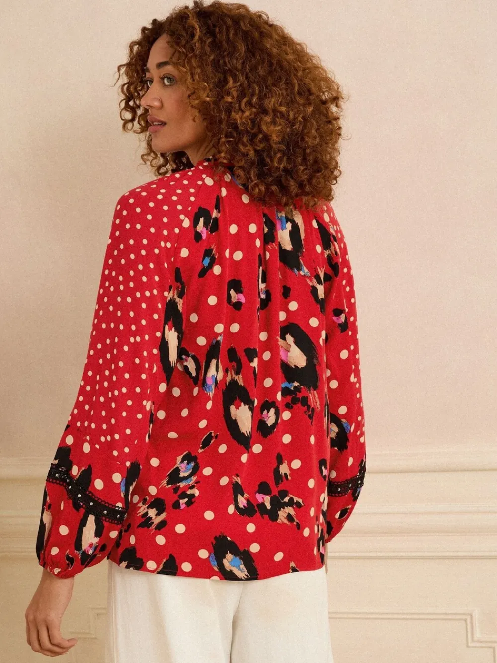 Make a bold statement with the Love & Roses Red Animal Notch Neck Long Sleeve Blouse, the perfect piece to instantly elevate any outfit. This vibrant blouse features an eye-catching red base adorned with an intricate animal print, creating a dynamic and fashionable look. Designed with a flattering notch V-neck feature and a button front with contrast black trim detailing. Whether paired with tailored trousers for a chic office ensemble or dressed down with jeans for a stylish weekend look, this blouse promises to turn heads and infuse your wardrobe with undeniable charm. V-neck Animal print Statement blouse 53% LENZING™ ECOVERO™ viscose, 47% viscose.
