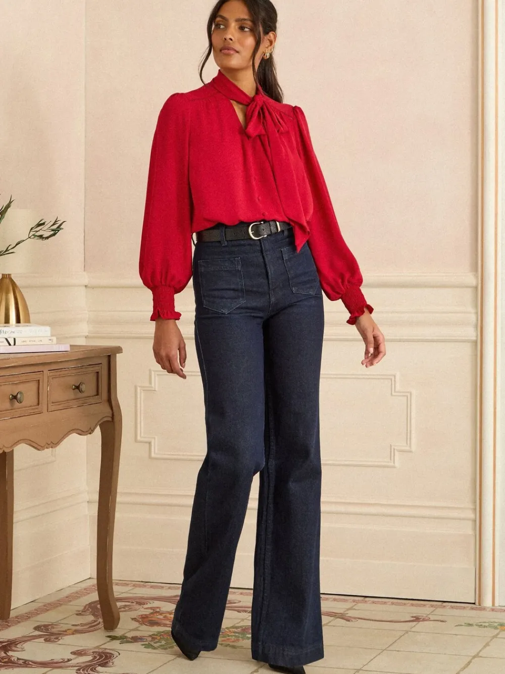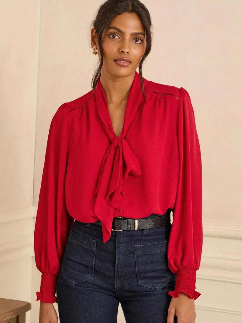 Inject vibrant colour and classic sophistication into your wardrobe with the Love & Roses Red Long Sleeve Pussybow Blouse. This is the perfect elevated basic, crafted in a striking scarlet hue and designed with a fluid, soft drape. The standout feature is the chic tie-neck detail, which can be styled as a neat bow or left loose for a more relaxed look. Long, voluminous sleeves gather elegantly into stylish smocked cuffs, adding a feminine touch. Versatile and beautiful, this blouse effortlessly transitions from the office to an evening out. Tie neck detail Elevated classic Long sleeve Hoofdbestanddeel 100% polyester. Voering 100% polyester.
