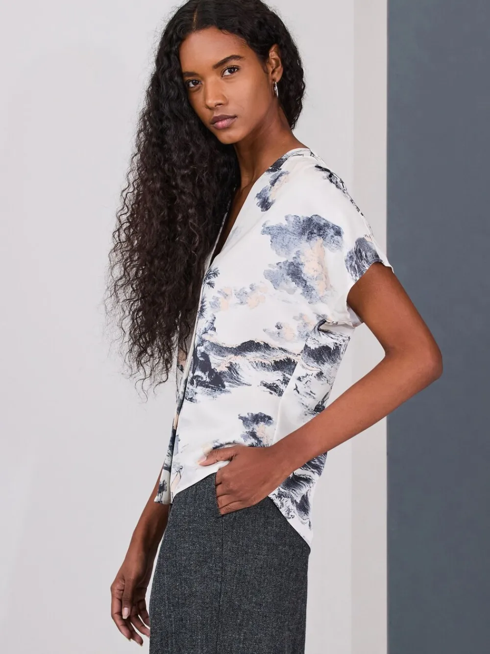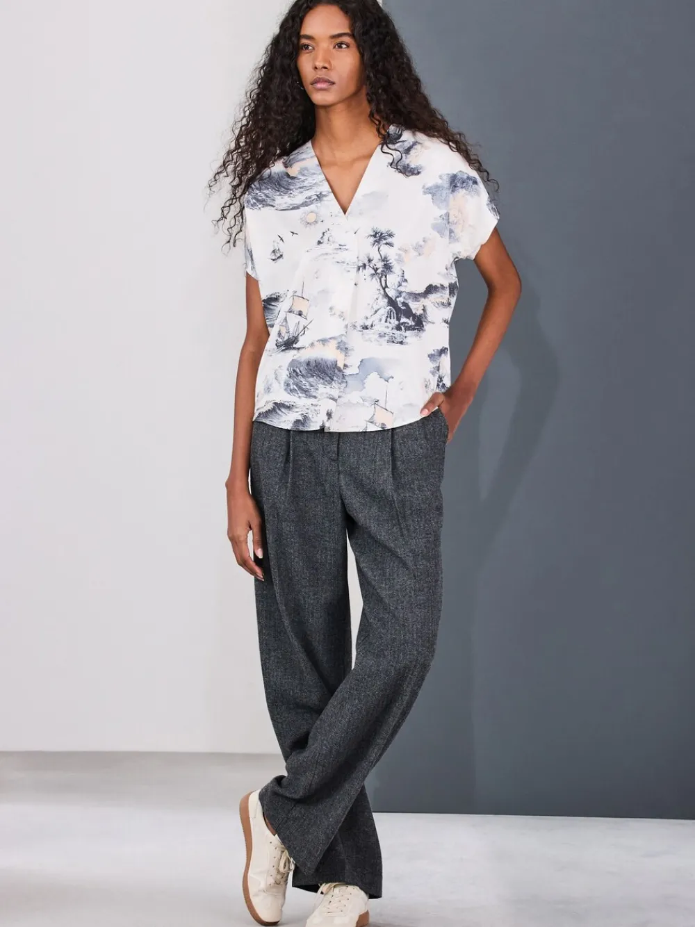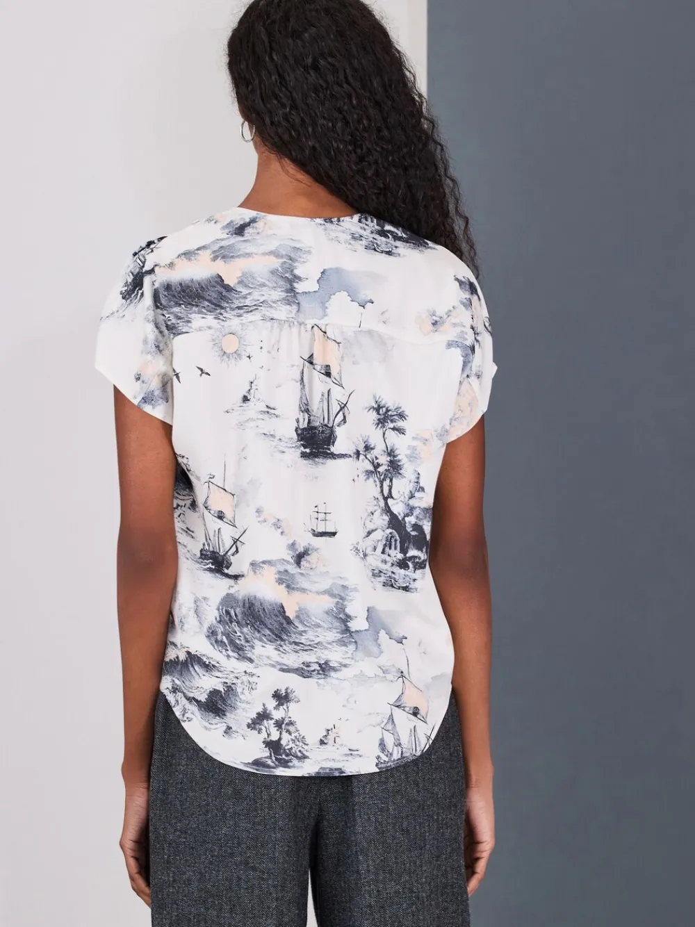 Elevate your wardrobe with this polished short sleeve blouse. Crafted from a fluid fabric, the flattering V-neck and abstract boat print provide a chic, artistic touch. Perfect for easy transitions from the office to weekend outings. Blouse Abstract boat print V-neck Short sleeve Fluid fabric Machinewasbaar. 100% gerecycled polyester. Artikelen met het curve-logo zijn verkrijgbaar in de maten 18 en groter.