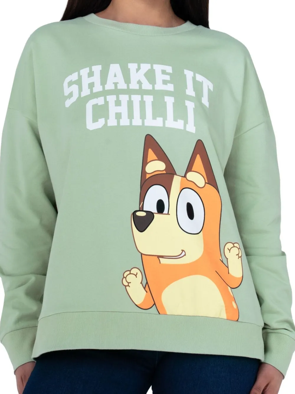 Laat de saaie sweatshirts maar zitten, er is een nieuwe trui in de stad en ze heeft moves! Op deze speelse Bluey-sweater voor dames staat Chilli Heeler, de koningin van de coole moeders, afgebeeld. Met de opvallende tekst “Shake It Chilli” op de voorkant voegt deze comfortabele trui een ondeugende charme toe aan je dagelijkse stijl. Zacht katoencomfort gecombineerd met een opvallend design, perfect voor boodschappen doen, ontspannen of om cadeau te doen aan je favoriete moeder. Officieel gelicentieerd, officieel fantastisch en ideaal als cadeau voor Moederdag of een thema met een blauwe vlag! Machinewasbaar. 100% katoen.