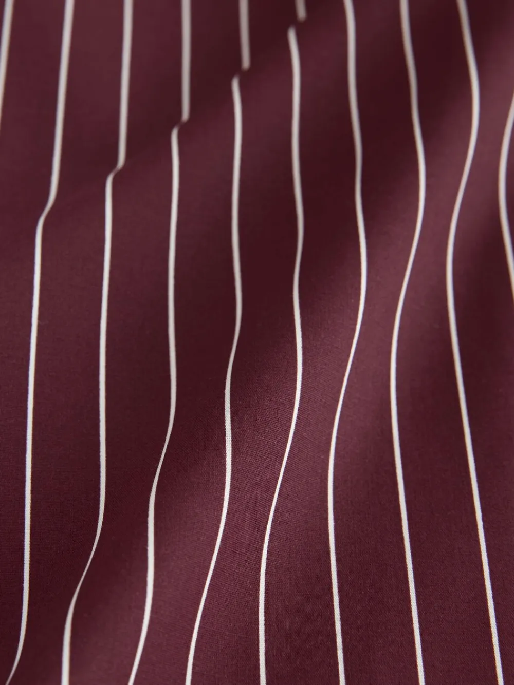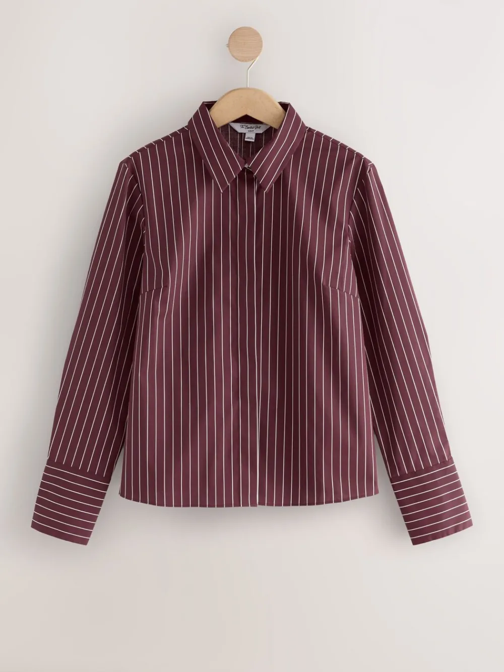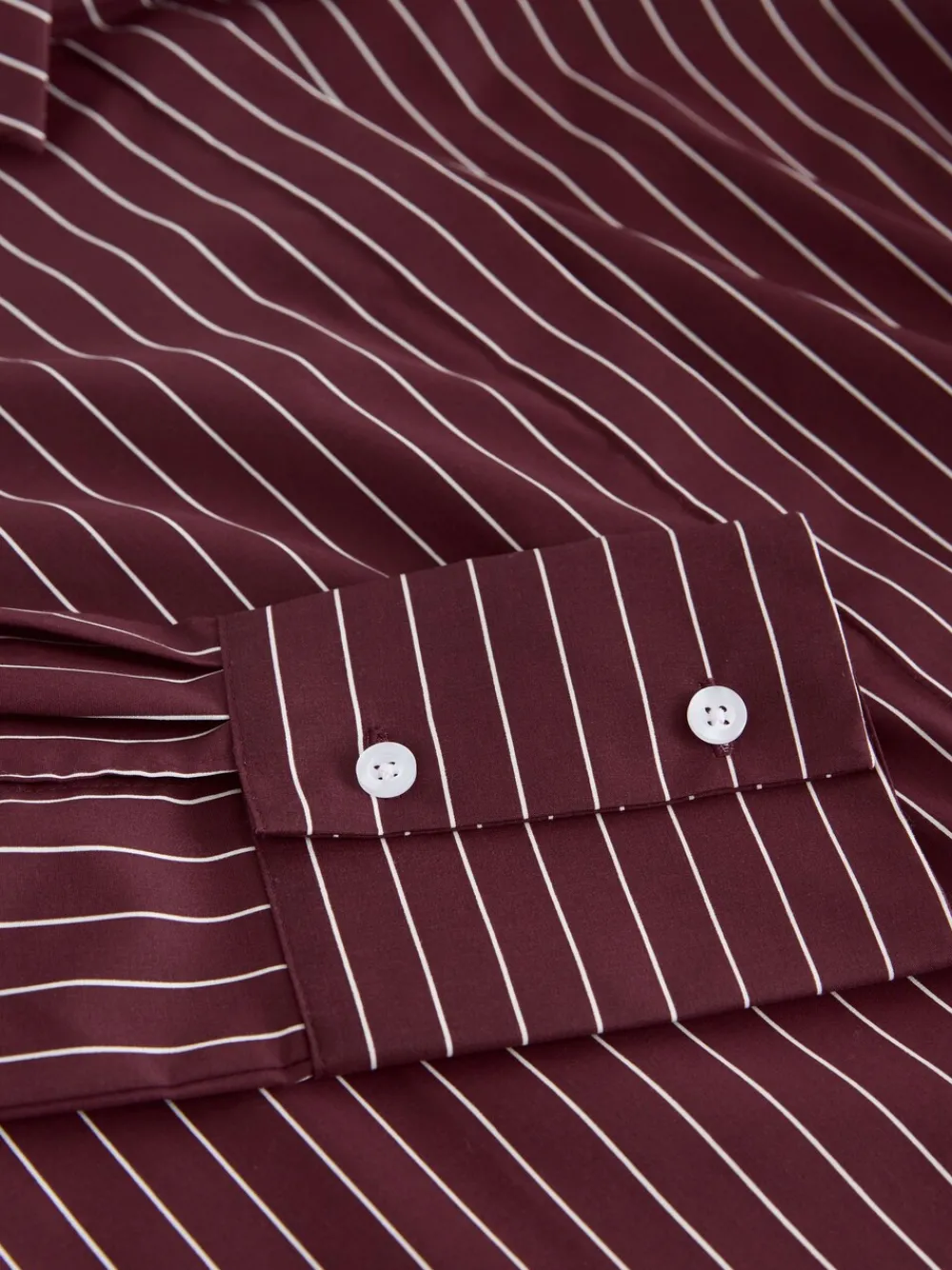 A key piece for your shirting needs, this essential fitted long-sleeve shirt in burgundy is a must-have for your wardrobe. The stretch design provides comfort and versatility, making it perfect for everyday wear, the office, or school. Vertical stripes Fitted stretch Collared Long sleeves Machinewasbaar. 62% gerecycled polyester, 33% katoen, 5% elastaan. Artikelen met het curve-logo zijn verkrijgbaar in de maten 18 en groter.