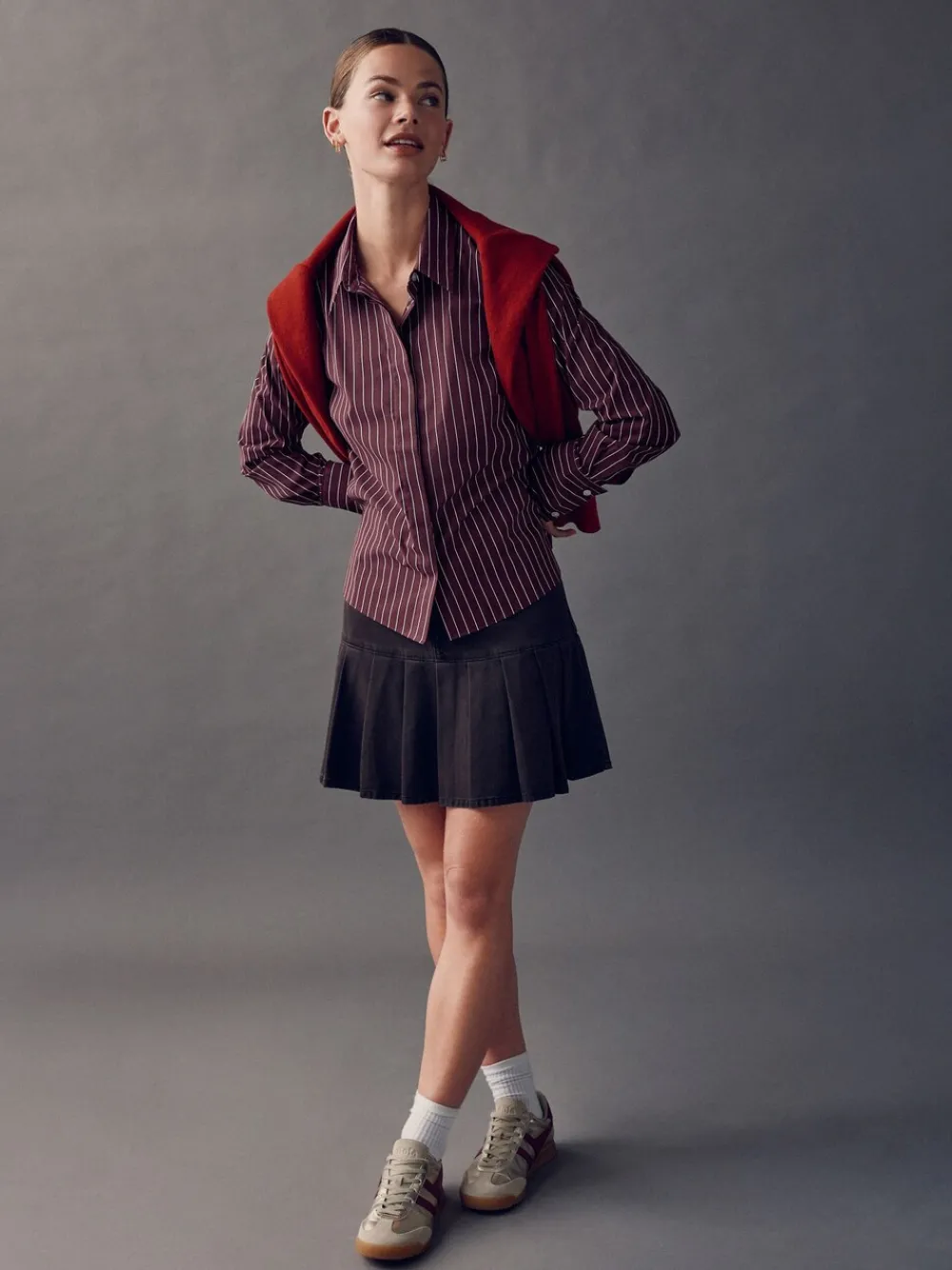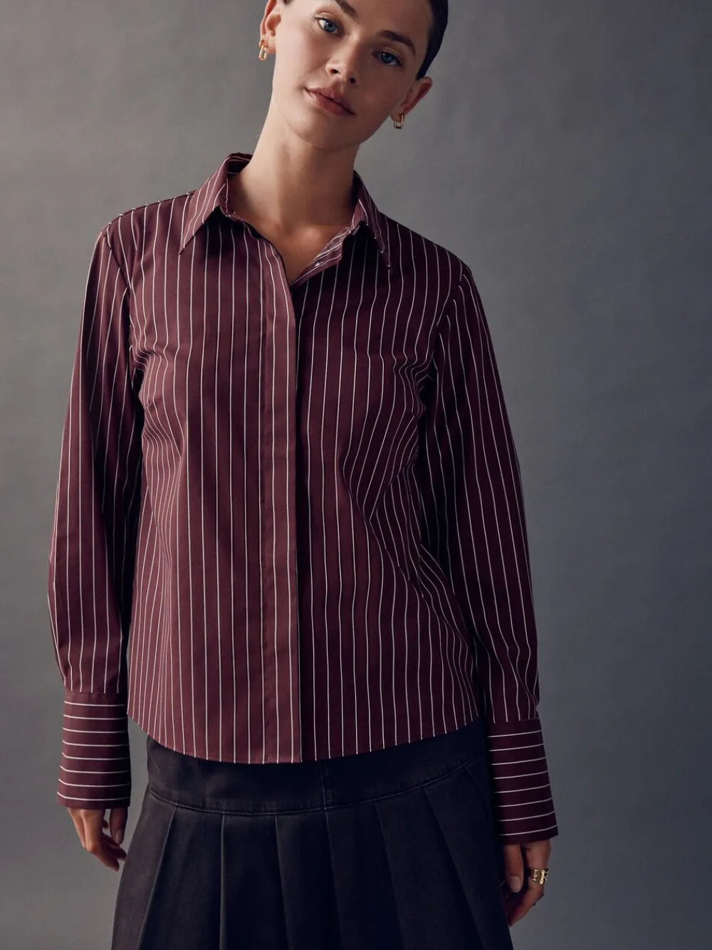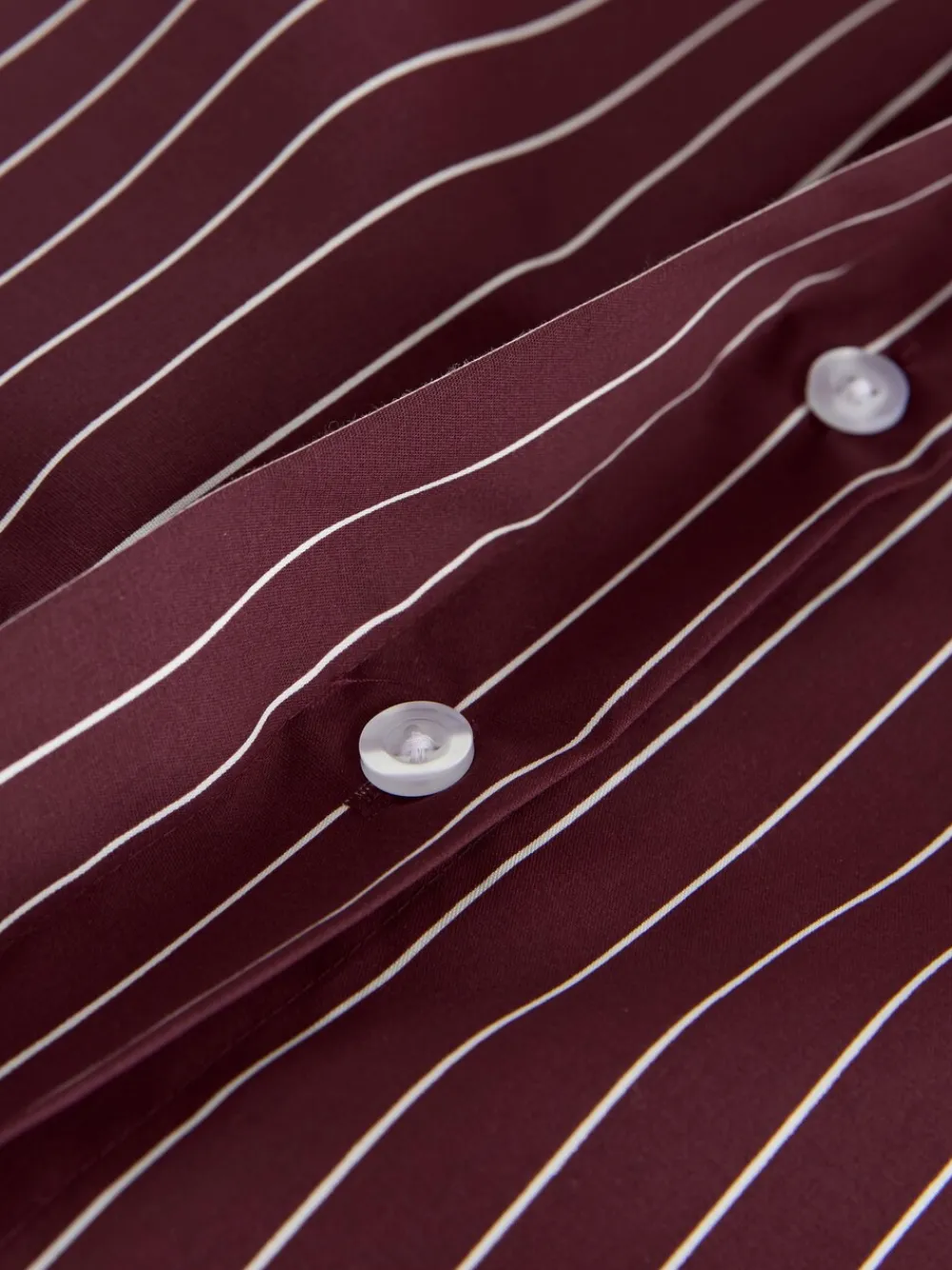A key piece for your shirting needs, this essential fitted long-sleeve shirt in burgundy is a must-have for your wardrobe. The stretch design provides comfort and versatility, making it perfect for everyday wear, the office, or school. Vertical stripes Fitted stretch Collared Long sleeves Machinewasbaar. 62% gerecycled polyester, 33% katoen, 5% elastaan. Artikelen met het curve-logo zijn verkrijgbaar in de maten 18 en groter.