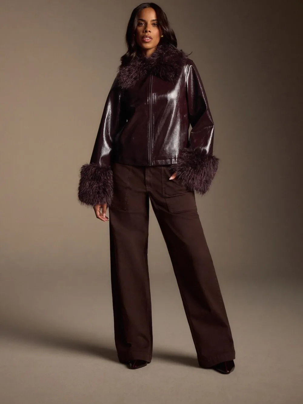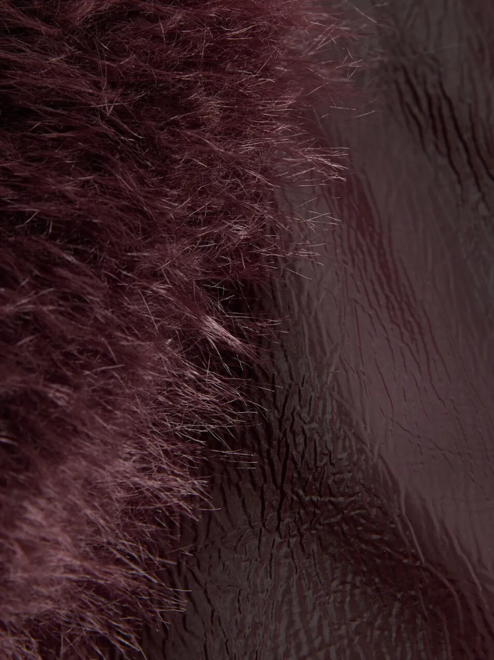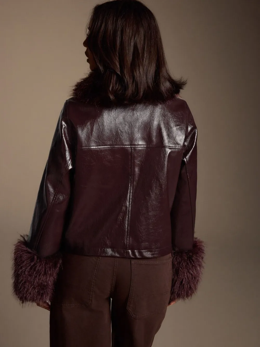 Make a bold statement with this stylish burgundy jacket. Featuring a luxurious faux fur collar and matching cuffs, it combines warmth with fashion. The zip fastening and practical pockets make it the perfect statement piece for your winter wardrobe. Faux Leather fabric Faux fur collar and cuffs Zip-up fastening Pockets Standaard van het midden van de nek tot de zoom 21.5″ / 54 cm. Buitenkant 100% gerecycled polyester met PU-coating. Rand 100% gerecycled polyester. Voering body 100% gerecycled polyester. Voering mouwen 100% gerecycled polyester.