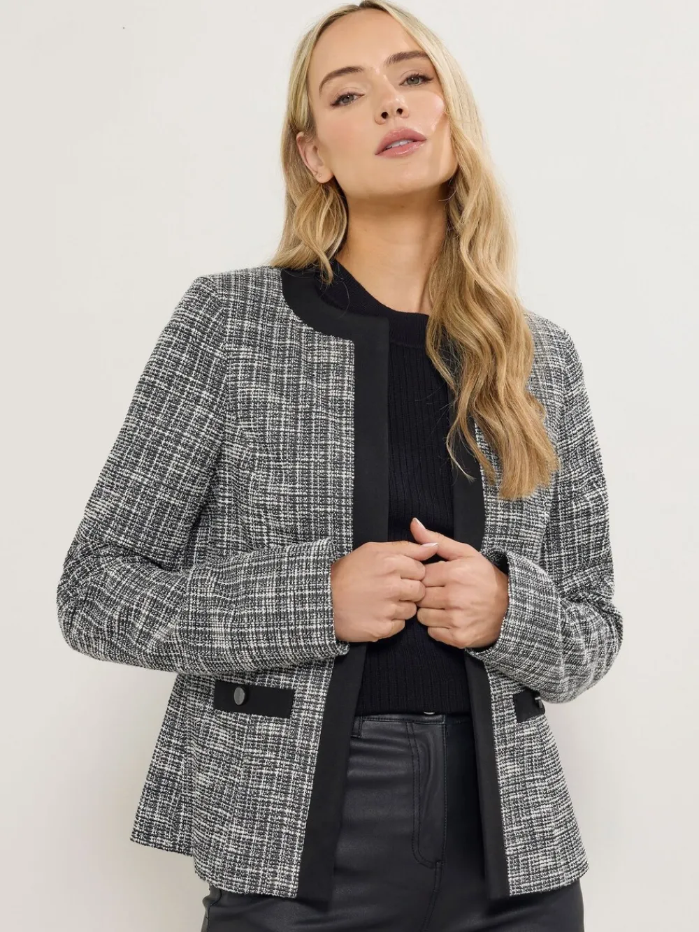 Fit & Fashion Notes:Extend your workwear layers with this boucle jacket. Made from a soft boucle fabric, it features a block hemline and completes with front tab pockets. Wear over any tailored piece for a formal finishing touch! Features: Boucle style Pocket tab detail Block hemline Made from a soft boucle fabric 82% polyester, 16% cotton, 1% elastane, 1% metallised fibre Machine washable Model is 5’11’ / 180 cm and size UK 10 / EU 38. Machinewasbaar. 82% polyester, 16% katoen, 1% elastaan, 1% gemetalliseerde vezels.