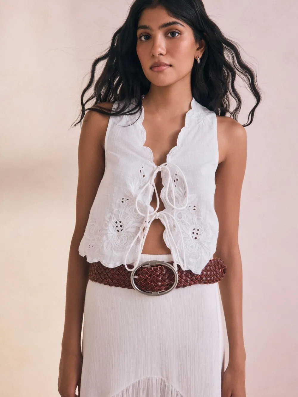 Deze stijlvolle brede riem heeft een western-geïnspireerd Designelement, met handgeweven leren details op de band en een oversized metalen gesp. Brede vorm Extra grote gesp Handgeweven leren band 100% leer.