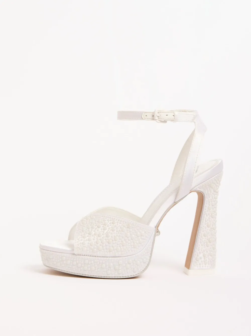 Elevate your bridal look with these beautifully timeless satin sandals. Adorned with faux pearl embellishments and featuring a high platform block heel, they offer a modern, elegant touch. Comfortable padding ensures you can dance through your wedding day in style. Satin material Pearl Detailing High Platform Block Heel Slim ankle strap Hakhoogte 11,5 cm. Bovenwerk – textiel; voering en voetbed – overige materialen, zool – Andere materialen.
