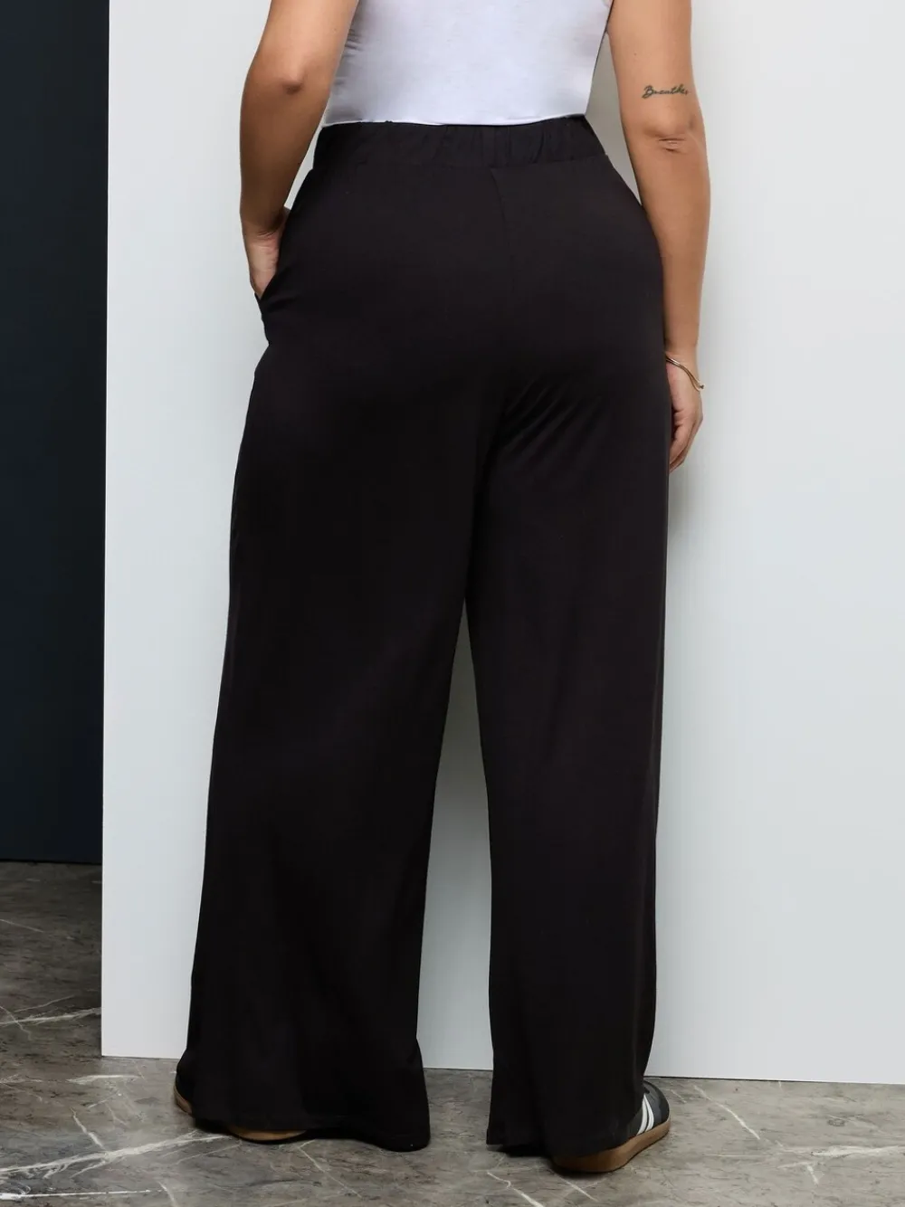 Fit Fashion Notes: Introduce these plus-size wide-leg trousers into your everyday collection. Made from a comfortable jersey fabric, they feature two side pockets and an elasticated waistband for the perfect fit. Team with a T-Shirt and trainers for easy off-duty appeal. Why We Love It: The perfect option for ease and comfort. Features: Wide leg design Elasticated waistband Two side pockets Made from a comfortable jersey fabric 95 viscose, 5 elastane Machine washable Model is 5ft 9.5/176.53 cm and size UK 16/EU 44. Machinewasbaar. 95% viscose, 5% elastaan.