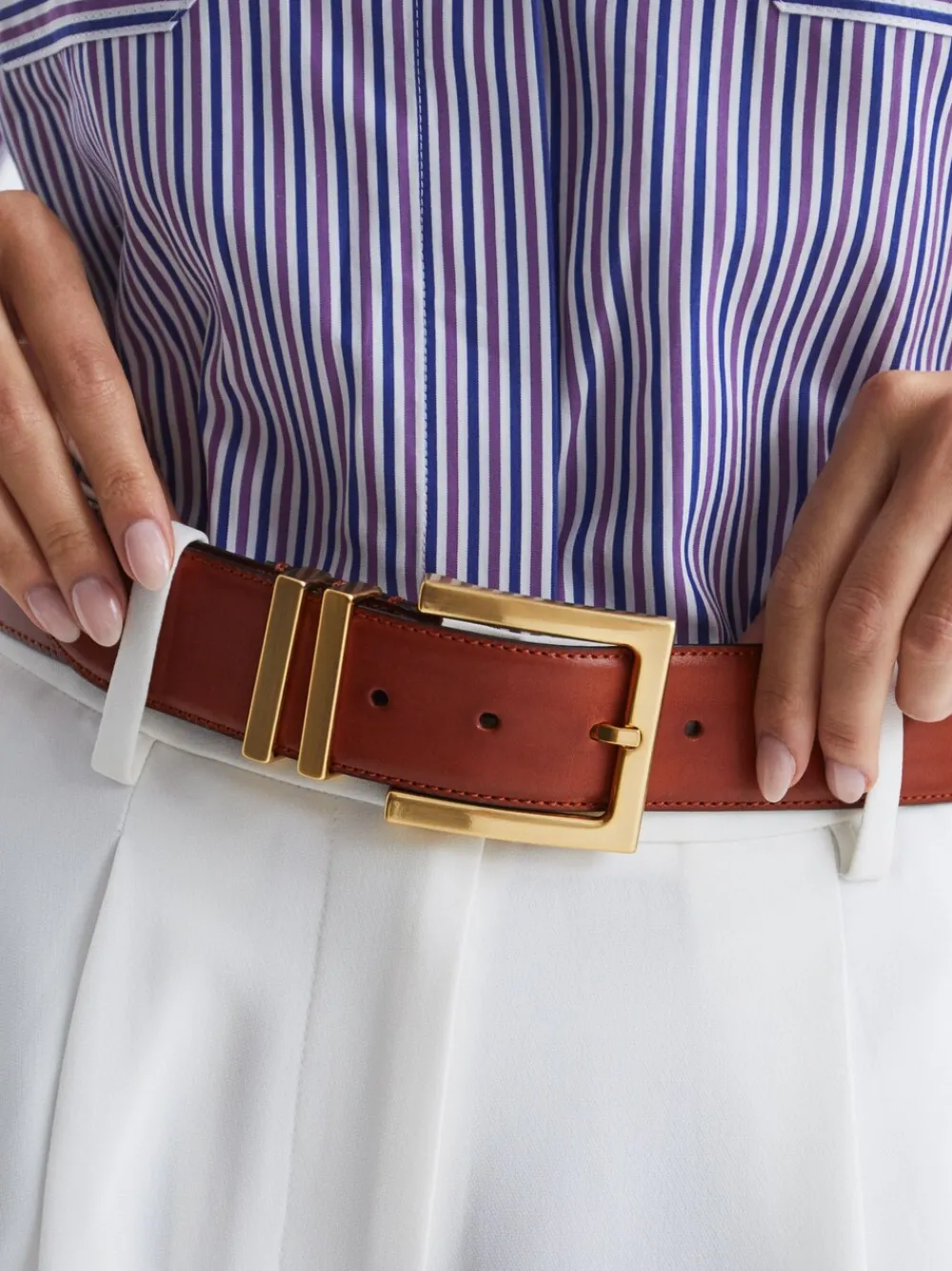 The tan Brompton belt is an effortlessly wearable style for complimenting outfits. It’s crafted from supple leather bordered by tonal topstitching. Wear it to anchor high-rise jeans and a tucked-in shirt. Leather fabrication Tonal top-stitching Gold-tone metal buckle Breedte 3,5 cm 100% leer.