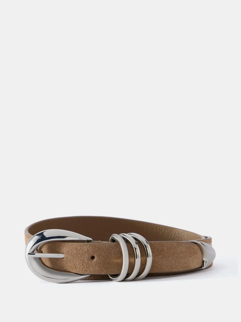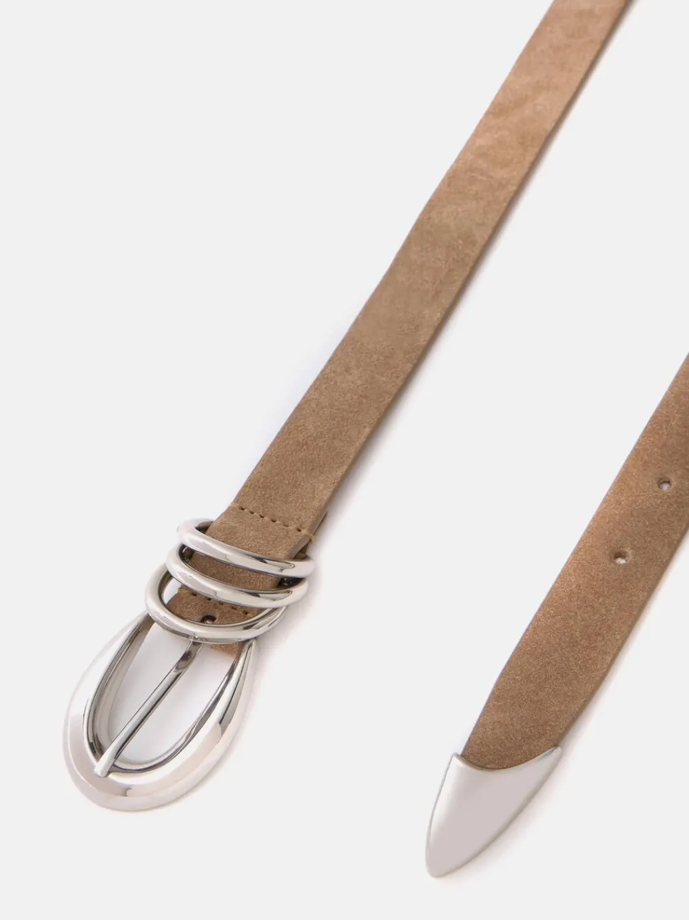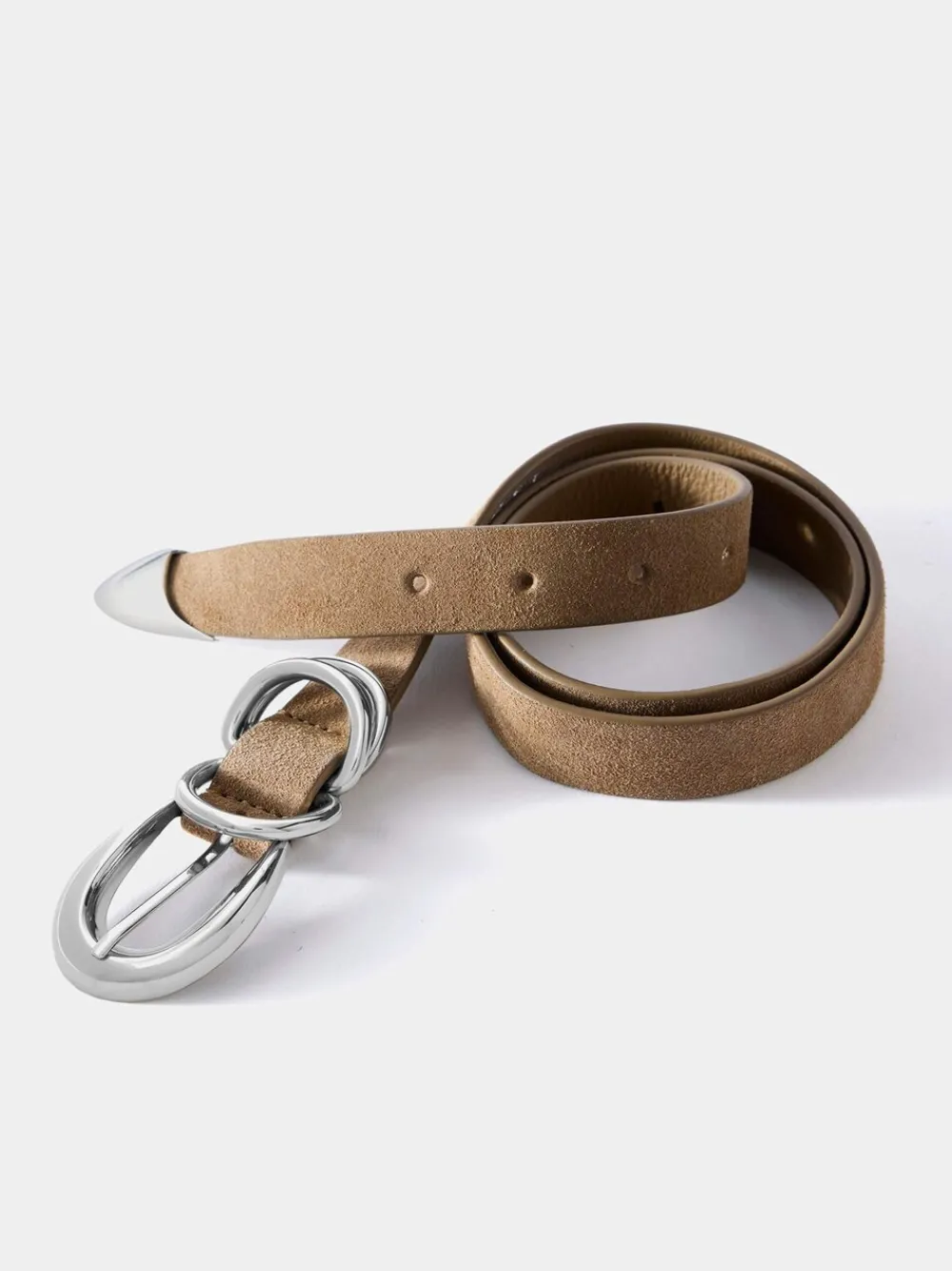 Tan suede belt featuring silver tone buckle fastening and hardware. 100% leer.
