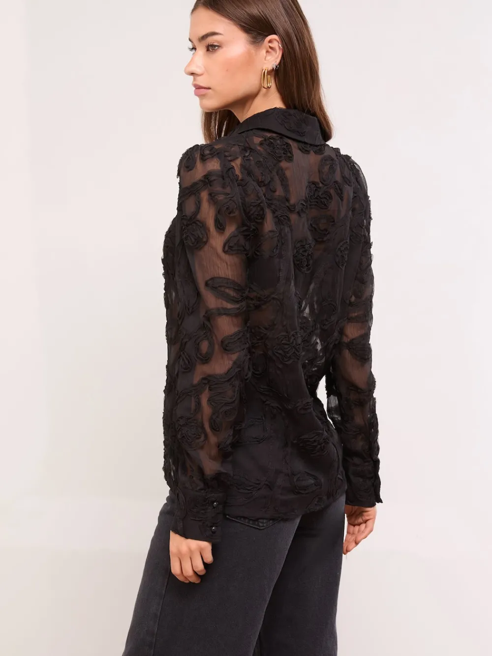 This Lipsy Floral Burnout Shirt in black is a subtle elevation on a wardrobe classic. The sheer floral burnout detailing and chic long sleeves add beautiful texture and sophistication. Perfect slightly unbuttoned for a relaxed daytime look or fully done up with trousers for workwear or a stylish evening outing. Floral burnout detailing Button-through front Collar detail Long sleeve 100% polyester.