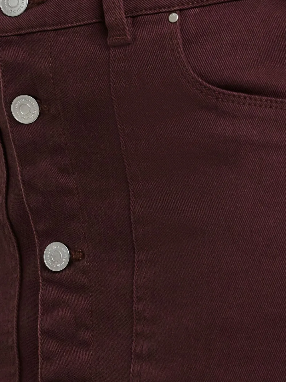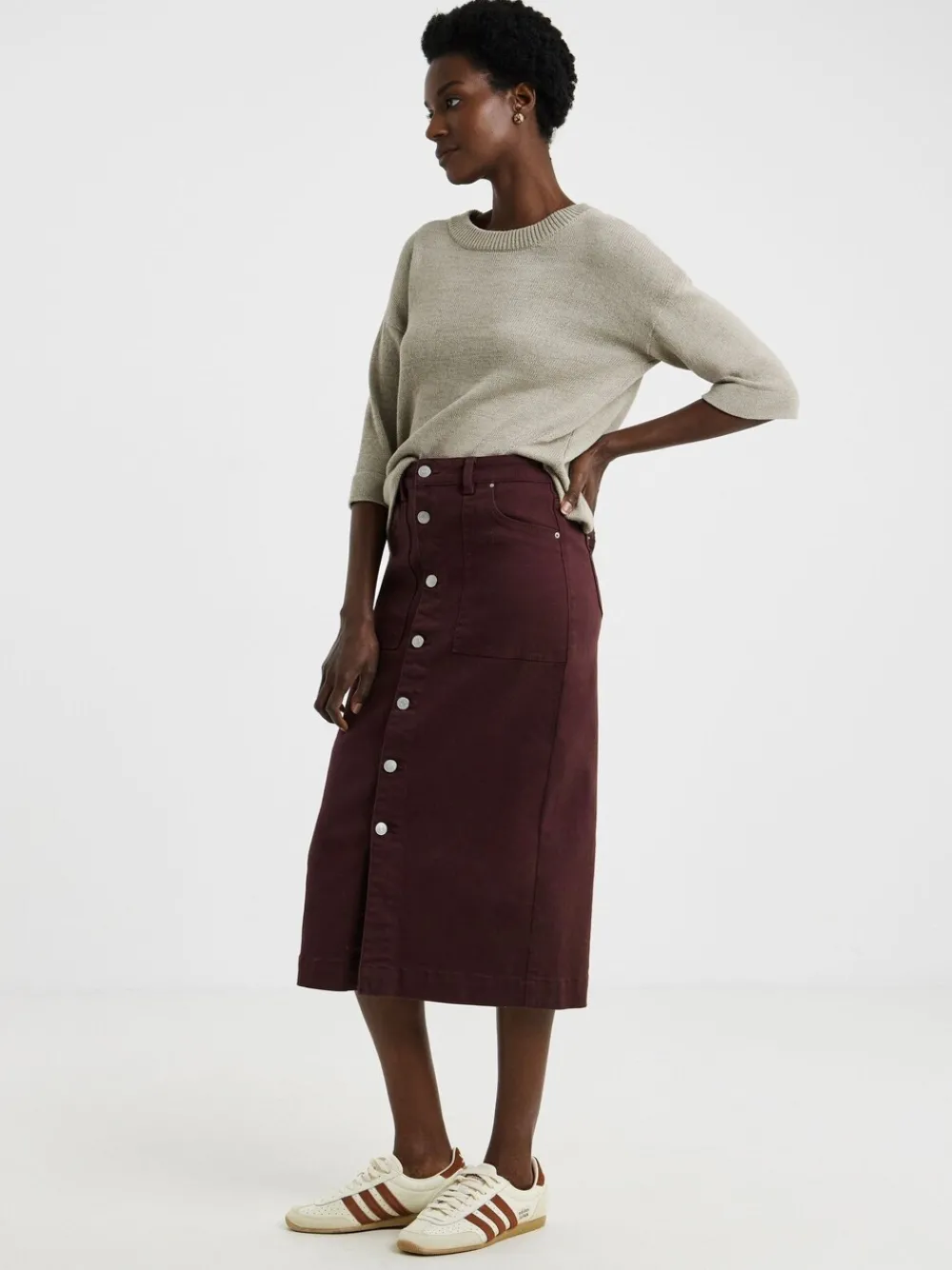 A skirt for all seasons, this burgundy skirt is the perfect everyday denim skirt. Featuring a button through front, flattering midi length, pockets and belt loops. Standaard van tailleband tot zoom 32″ / 81 cm. Machinewasbaar. 98% Katoen, 2% elastaan.