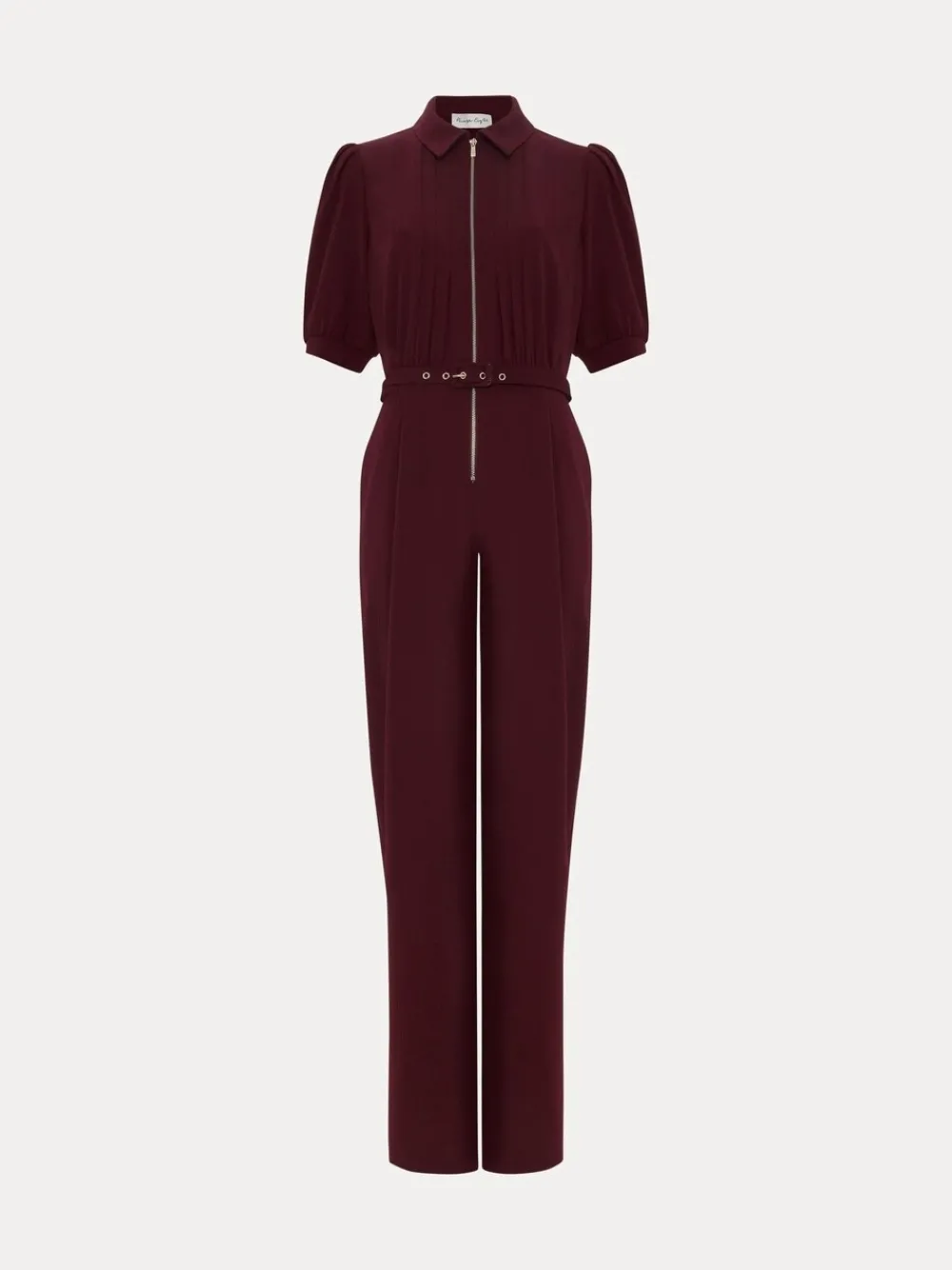 Say hello to your new all-in-one style, this wide-leg burgundy jumpsuit is designed with gold zip detailing and a matching belt for a contemporary finish. The collared neckline and feminine puff sleeves add touch of polish, falling through to a wide-leg silhouette that pairs perfectly with your favourite boots for an off-duty look. Machinewasbaar. 80% polyester, 20% elastaan.
