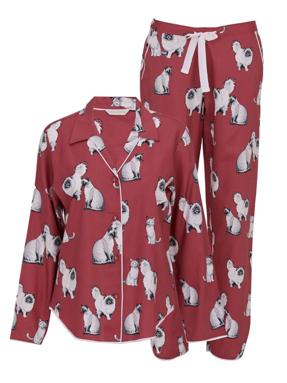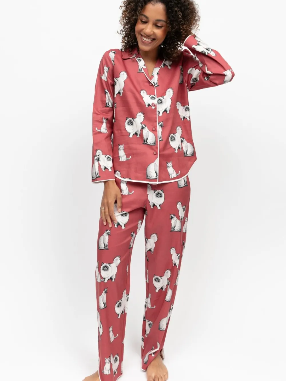Taking its cues straight from the masters of downtime, with white cats painted across a terracotta orange base, the Cat Print Pyjama Set is a reminder that lounging is best done with a little attitude. The long sleeve top, with its pointed collar and modal-covered buttons, has just enough structure to keep you looking collected, even if you’re mid-sprawl. The matching bottoms balance the look with a relaxed, straight-legged cut, an elasticated back waist, and an adjustable drawstring, which makes them easy to slip into the moment the day’s hustle is over. Cream modal piping traces both pieces, softening the seams and adding a refined structure. Made in a 60% cotton 40% modal blend that’s equal parts breathable and soft, whether you’re claiming the best spot on the sofa or committing to a full catnap, this pyjama set has you covered for downtime done properly. Machinewasbaar. 60% katoen, 40% modal.