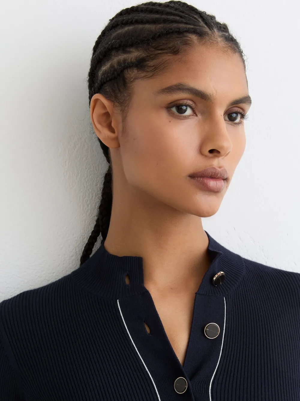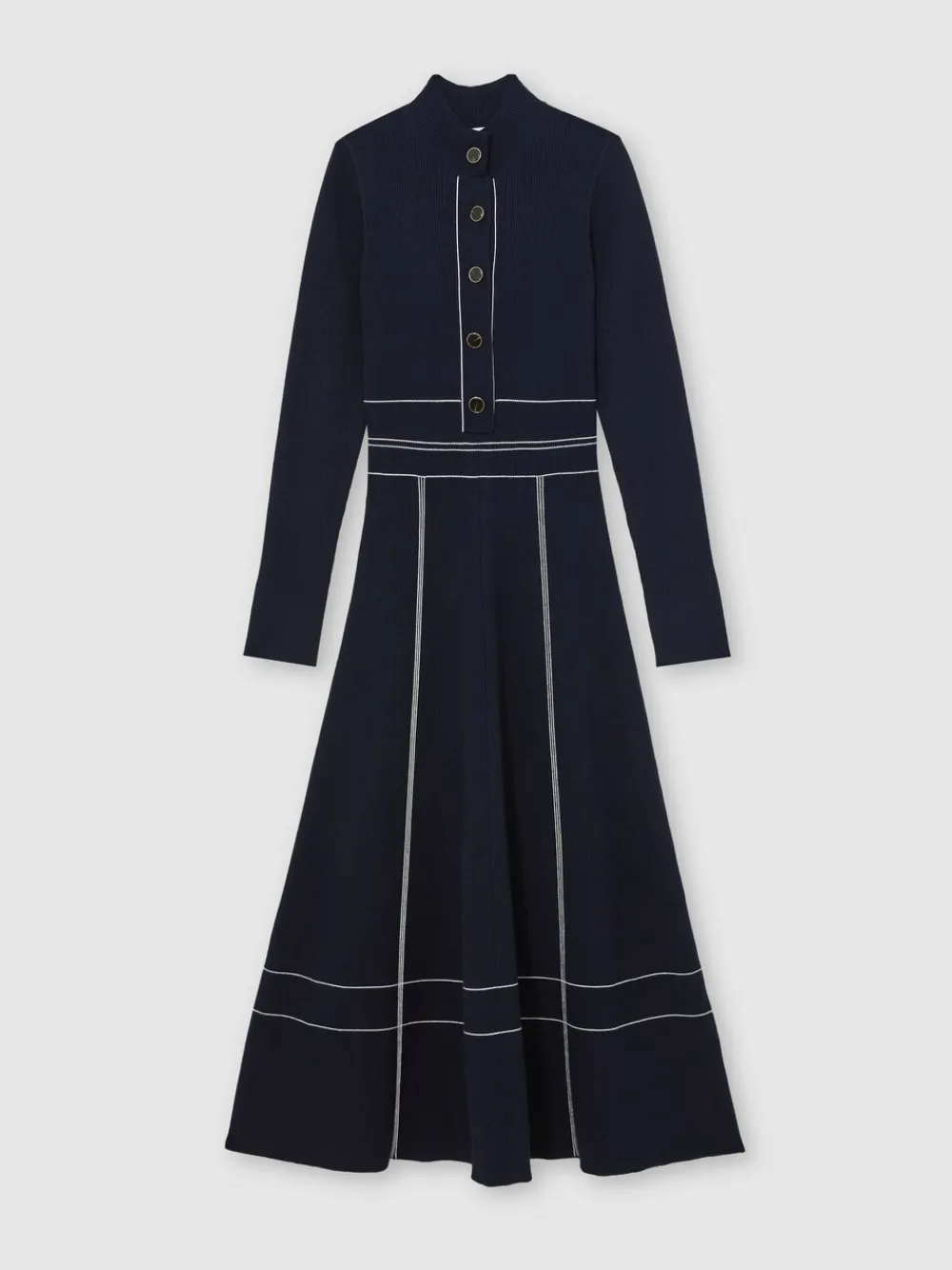 The Charlie midi dress is rib-knitted with a contoured fit and subtly flared skirt. Contrast stitching frames the silhouette, with a buttoned placket and high neckline completing the style. Fine rib-knit Skater silhouette Contrast stitching High neckline Half-button placket The model is wearing a size S Measurements of model: 5ft9 / 175cm Standaardmaat van de zijkant van de nek tot de zoom 48″ / 122 cm. Alleen met de hand wassen. 59% viscose, 24% polyester, 16% nylon, 1% elastaan.