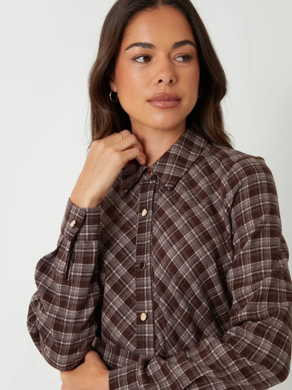 Elevate your everyday wardrobe with this timeless check belted midi shirt dress from Threadbare. Check patterned fabric. Long sleeves with gold shank button cuffs. Gold shank button front fastening. Collared neck. Patch pockets on chest. Self fabric belt around waist. Midi length. Model wears UK size 8. Machinewasbaar. 67% polyester, 30% viscose, 3% elastaan.