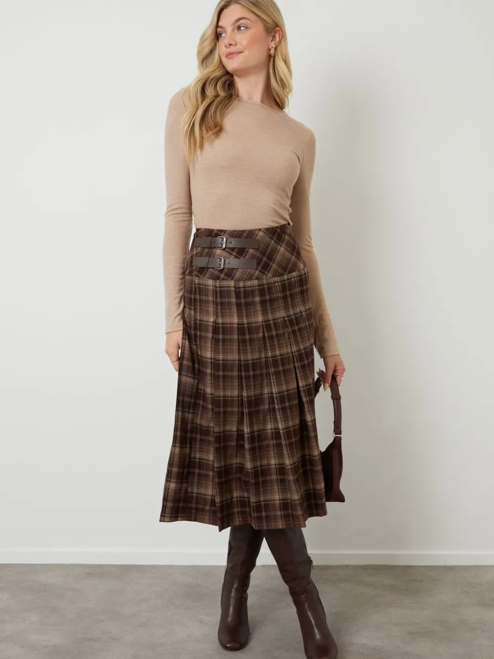 Elevate your everyday style with our check buckle detail midi skirt. Cut in a timeless check pattern, this flattering midi silhouette features two faux leather buckle straps at the waist for a touch of modern edge. A neat side zip ensures a smooth, comfortable fit, while the clean lines make it an effortless piece to dress up or down. Pair with a fine knit or crisp shirt for a polished look that transitions seamlessly from day to evening. Model wears UK size 8./……… Machinewasbaar. 85% polyester, 10% viscose, 5% elastaan.