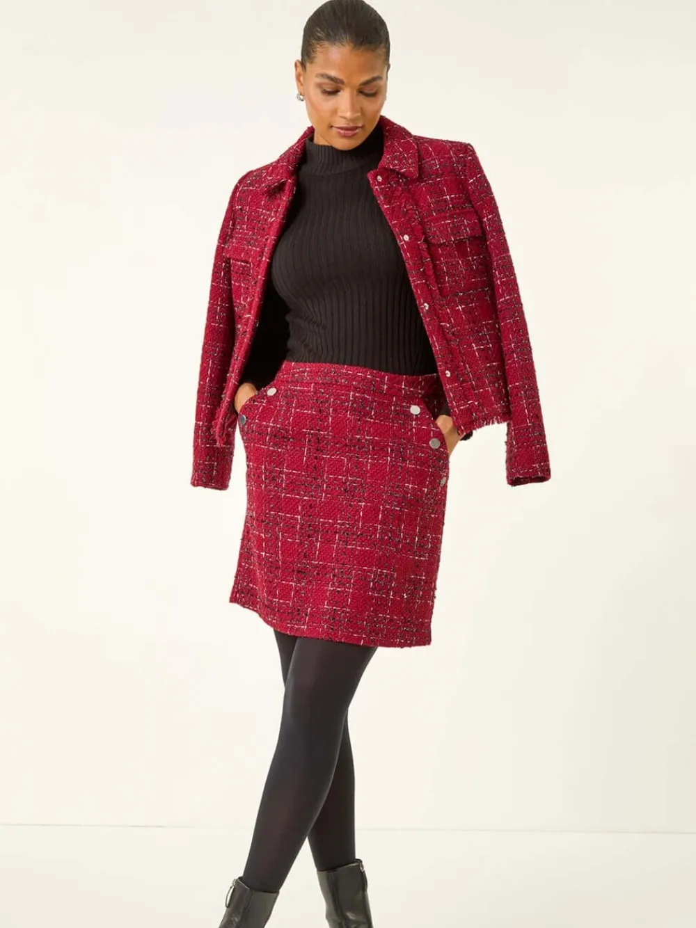 Voeg wat verfijning toe aan uw herfst-/wintergarderobe met deze chique boucle rok met ruitjesmotief. Deze A-lijn rok heeft een subtiel ruitjespatroon en een rits voor eenvoudig dragen. Voor een verzorgde afwerking is het geheel afgewerkt met een knoopdetail en voering. Combineer met een strak overhemd, panty’s en hakken voor een stijlvolle kantoorlook die naadloos overgaat in een avondborrel! Standaard van tailleband tot zoom 19″ / 48 cm. Machinewasbaar. 70% Polyester, 12% Acrylic, 7% Viscose, 4% Wool, 4% Cotton, 3% Nylon.