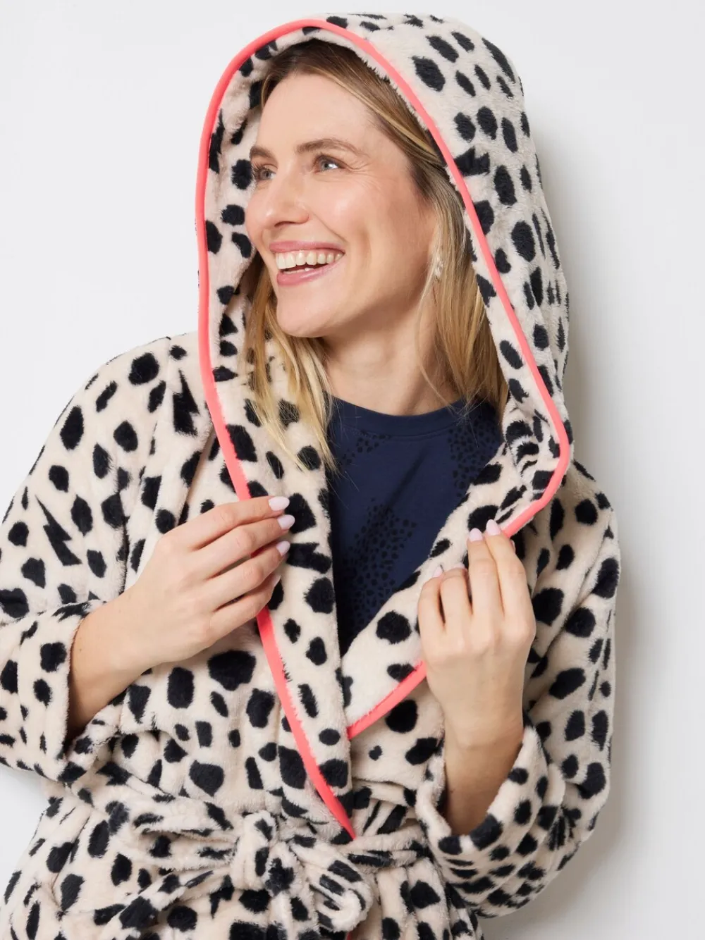 Wrap up warm in our super-soft and cosy cream with black cheetah print dressing gown. Featuring a cosy hood, long sleeves and spacious front pockets, it fastens with a self fabric tie belt. Perfect for wrapping up warm on chilly mornings and evenings. Made from soft polyester Two deep front pockets Neon coral piping on hood and centre front Wrap fastening and self fabric tie belt Matching kids dressing gown also available Signature neon pink embroidered lightning bolt on the sleeve True to size. Model is Size 8 Height 5 9.5″ Wearing a size 8 Machinewasbaar. 100% polyester.