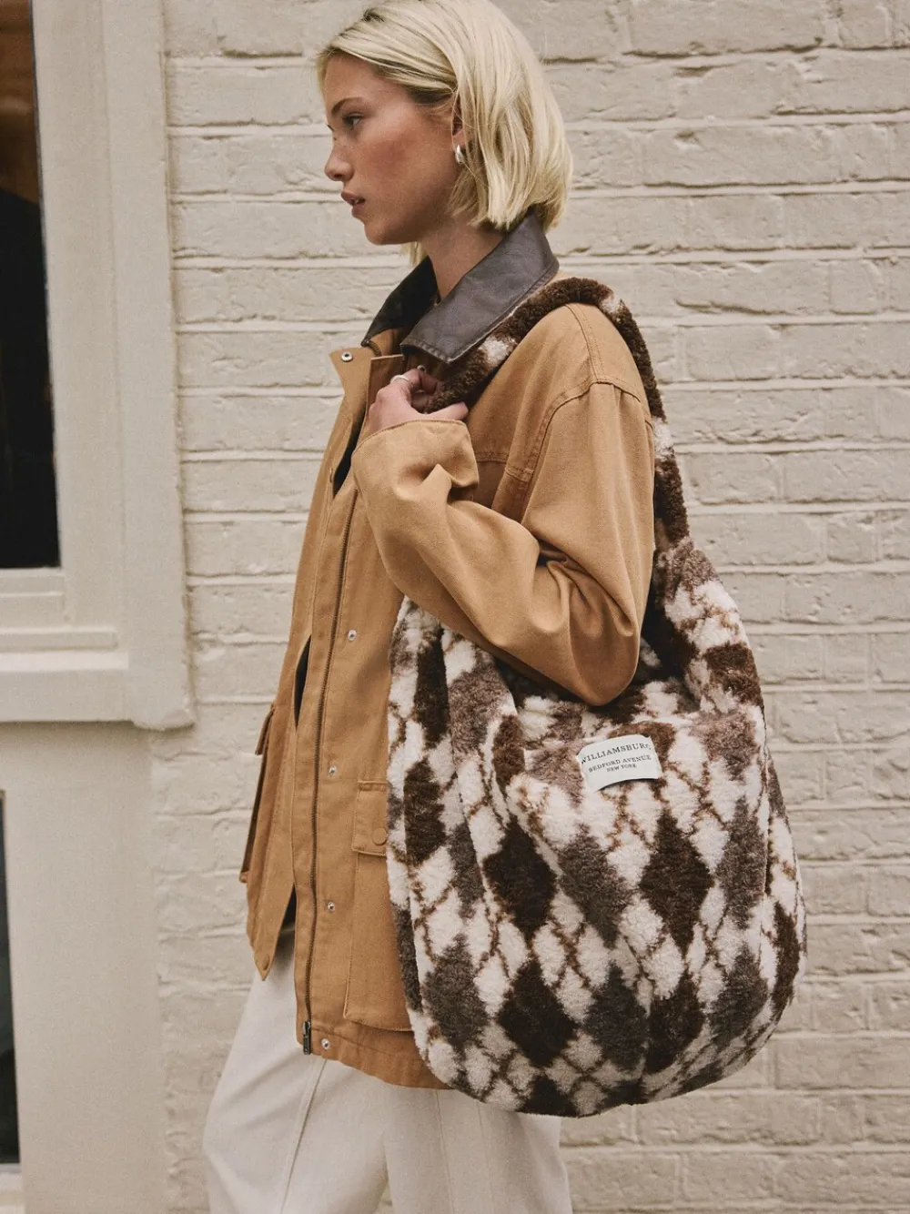 Embrace cosy chic with this shoulder bag, featuring a chocolate brown argyle pattern. The soft texture and spacious hobo style make it a trendy choice for casual weekend outings. Secured with a magnetic closure to keep your essentials safe. Argyle pattern Shoulder strap Magnetic closure Internal zip pocket Hoogte 48 cm Breedte 50 cm Diepte 1 cm Hoofdbestanddeel 100% polyester. Voering 100% gerecycled polyester.