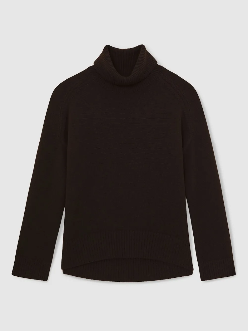 The Brooklyn jumper is knitted from a luxurious wool-cashmere blend with a relaxed shape and raglan shoulders for an effortless feel. A ribbed roll-neck enhances its cosy feel, while a ribbed hem and cuffs offer a refined finish. Wool-cashmere blend Roll neck Raglan sleeves Ribbed trims The model is wearing a size S Measurements of model: 5ft9 / 175cm Alleen met de hand wassen. 91% wol 9% cashmere.