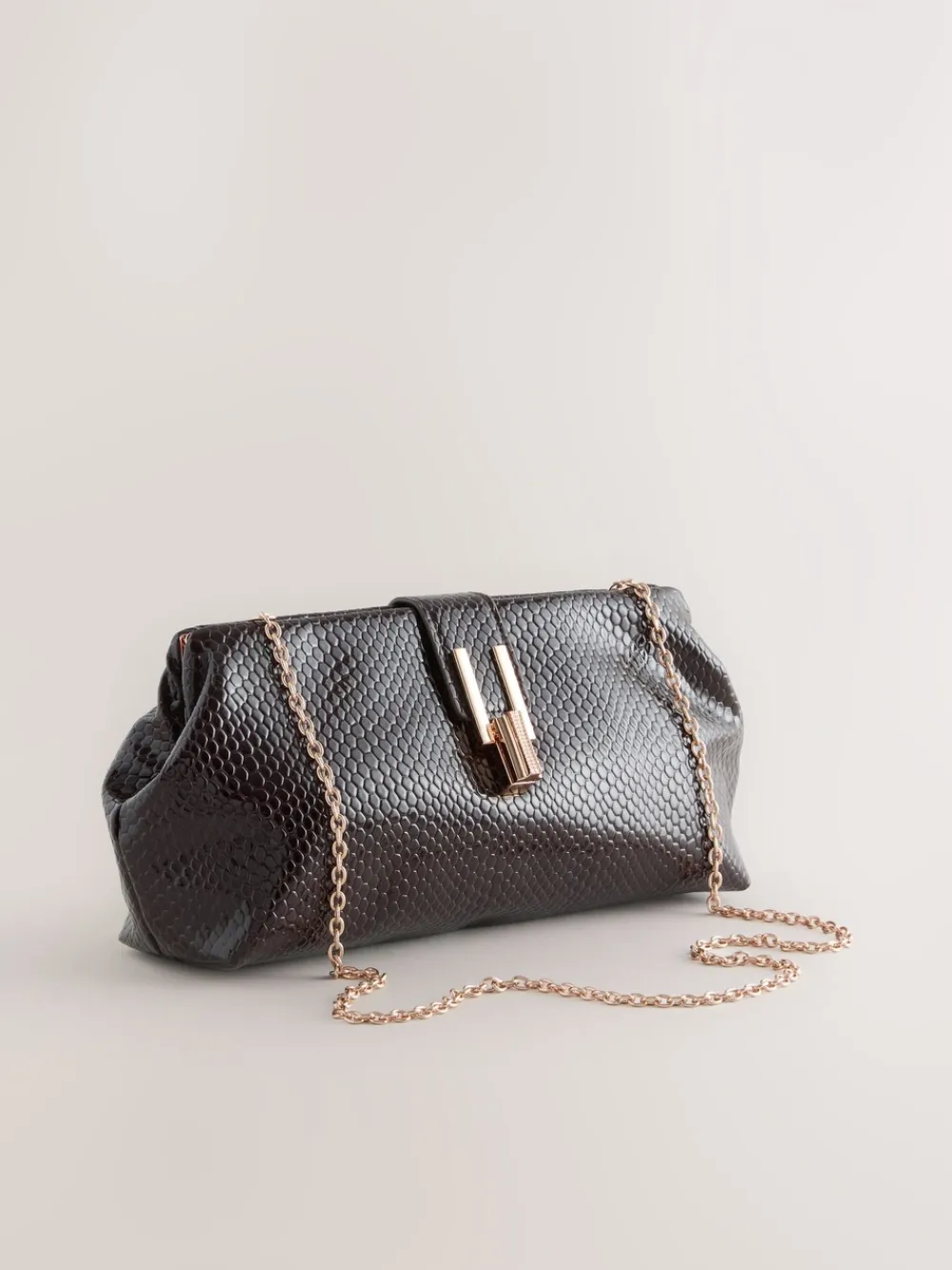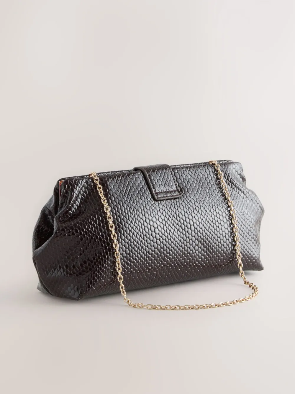 Maak je avondlook compleet met deze chocolade Bruin Clutch. Het ruime, gerimpelde ontwerp en het gestructureerde frame zorgen voor een moderne uitstraling, terwijl de elegante draaisluiting ervoor zorgt dat uw spullen veilig opgeborgen zijn. Voor veelzijdig gebruik wordt het geleverd met een optionele Goudkleurige kettingband, perfect voor een avondje uit of een speciale gelegenheid. Ruime Clutch Draaisluiting Optionele kettingriem Interne zak Gestructureerd frame Hoogte 13 cm Breedte 25 cm Diepte 7 cm Buitenkant 100% PU. Voering 100% gerecycled polyester.