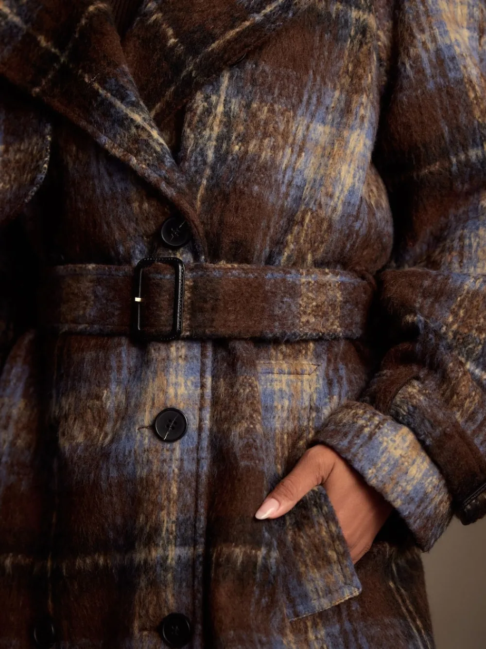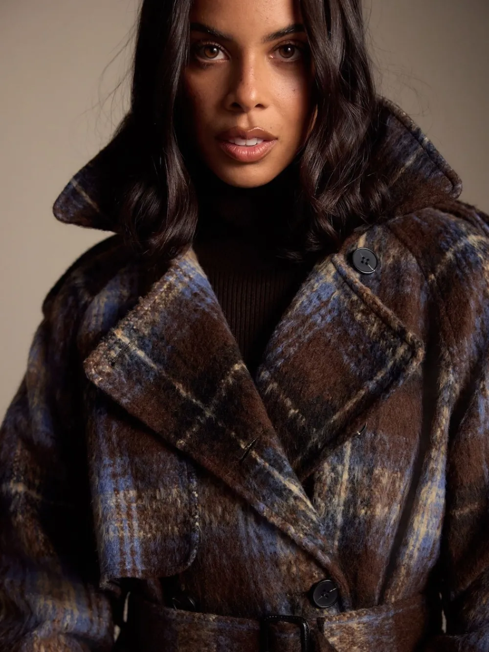 Make a bold statement this season in this checked trench coat. Featuring a classic belted waist, wide lapels, and traditional storm flaps, the textured check fabric provides exceptional warmth and style. Perfect for a sophisticated winter look. Check print Double breasted Belted waist Wide lapels Epaulettes Button-up fastening Standaard van het midden van de nek tot de zoom 48.5″ / 123 cm. Door gespecialiseerde stomerij laten reinigen Buitenkant 100% gerecycled polyester. Voering 100% gerecycled polyester.