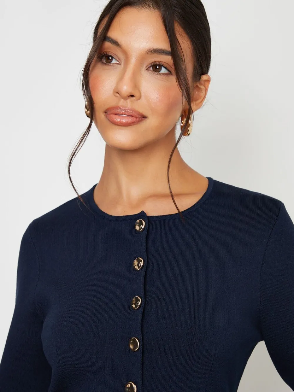 Elevate your layering with this chic knitted cardigan from Threadbare. Ribbed knitted fabric. Round neck. Cinched waist with seam. Long sleeves. Metallic gold tone button up fastening. Model wears UK size 8. Machinewasbaar. 51% polyester, 33% viscose, 16% nylon.