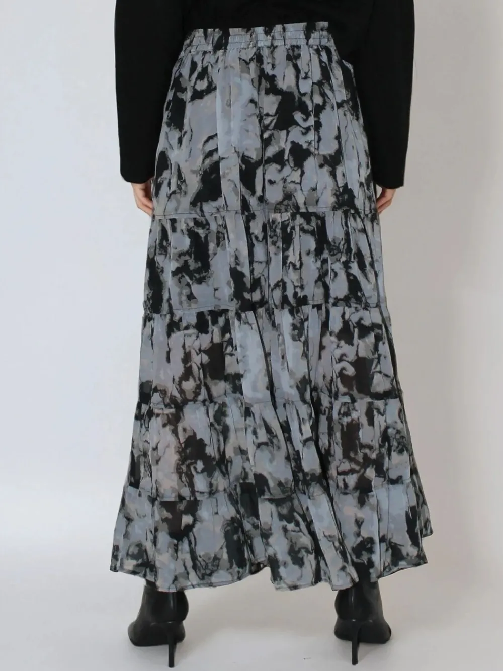 The relaxed fit of the Citrine Maxi Skirt makes it an easy and versatile style, crafted in our abstract Solvent print in black, brindle, and grey tones. The maxi-length skirt features an elasticated waistband at the back for ease and comfort, is long and tiered with gathered panelling, and has a short lining for a sheer solid trend. Wear with a jumper or T-Shirt for an effortless everyday outfit. The model wears a size 10. Length from the top: 92 cm. Standaard van tailleband tot zoom 36″ / 92 cm. Machinewasbaar. Buitenkant 100% polyester. Voering 100% viscose.