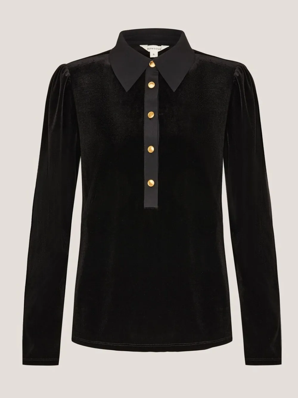 Shirts, elevated. No A/W wardrobe is complete without a bit of velvet to choose from. Designed with a sharp collar and gold button placket, this top is a versatile option to dress down with jeans or tuck into statement flares. Machinewasbaar. 95% polyester, 5% elastaan.